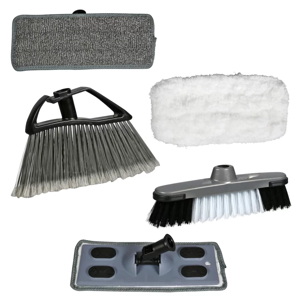 Assortment Details: Essentials™ Floor Cleaning System Tool Heads assorted among 1 wide broom head, 1 angled broom head, 1 wet/dry flat mop head, 1 microfiber duster/mop pad, and 1 microfiber light-duty mop pad.