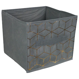 Assortment Details: 9x9x8-in. Essentials™ Geometric Collapsible Storage Containers with Handles assorted between gray or navy blue with gold geometric patterns on the front.