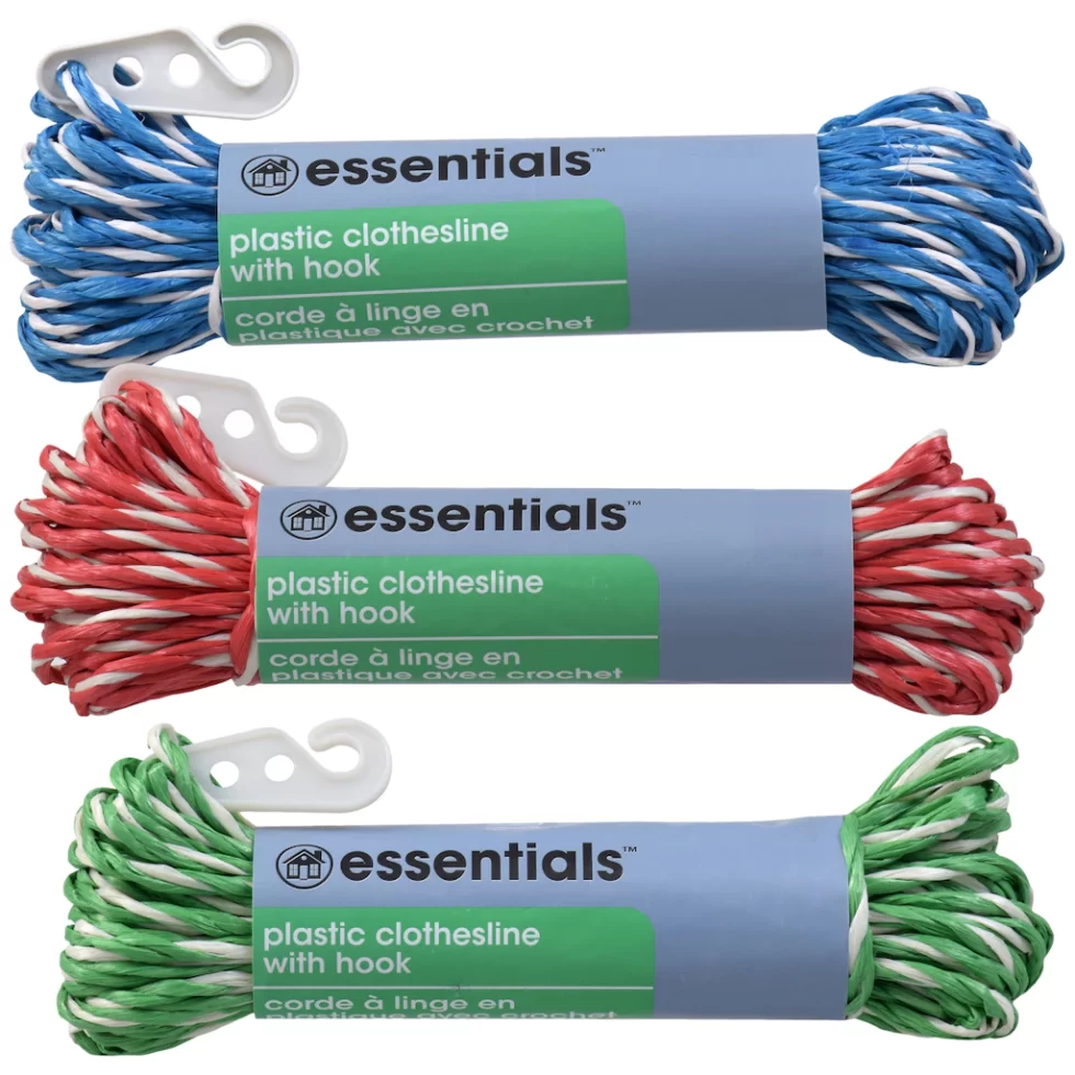 Assortment Details: Essentials Plastic Clothes Lines and Hooks assorted among green, blue, and red.