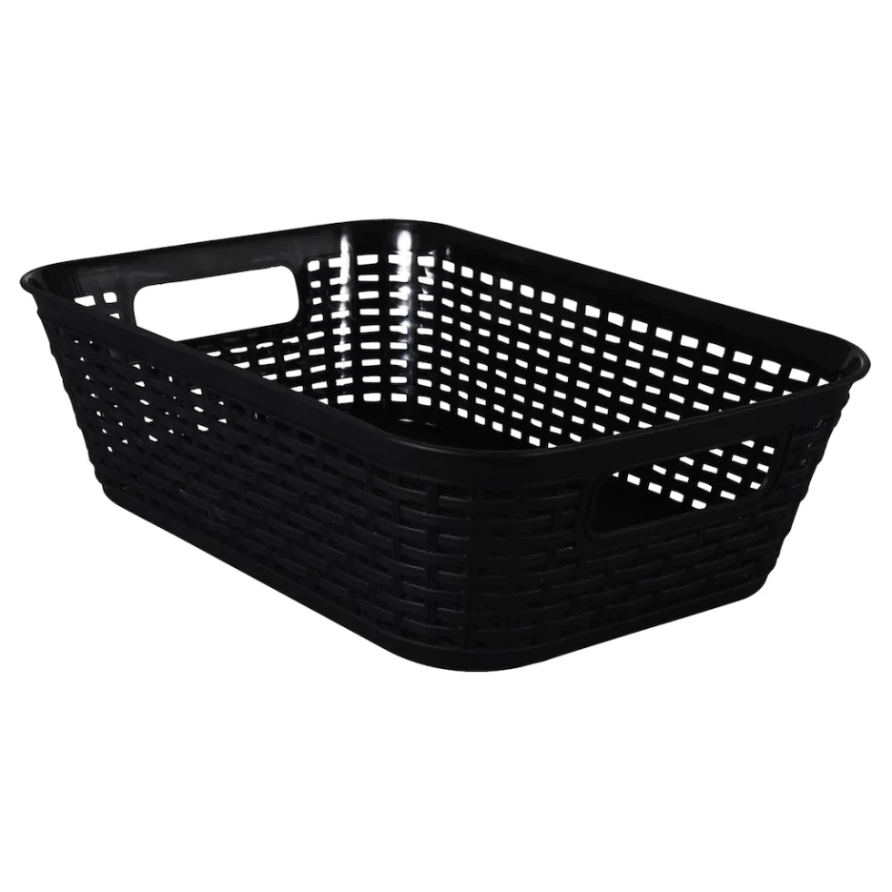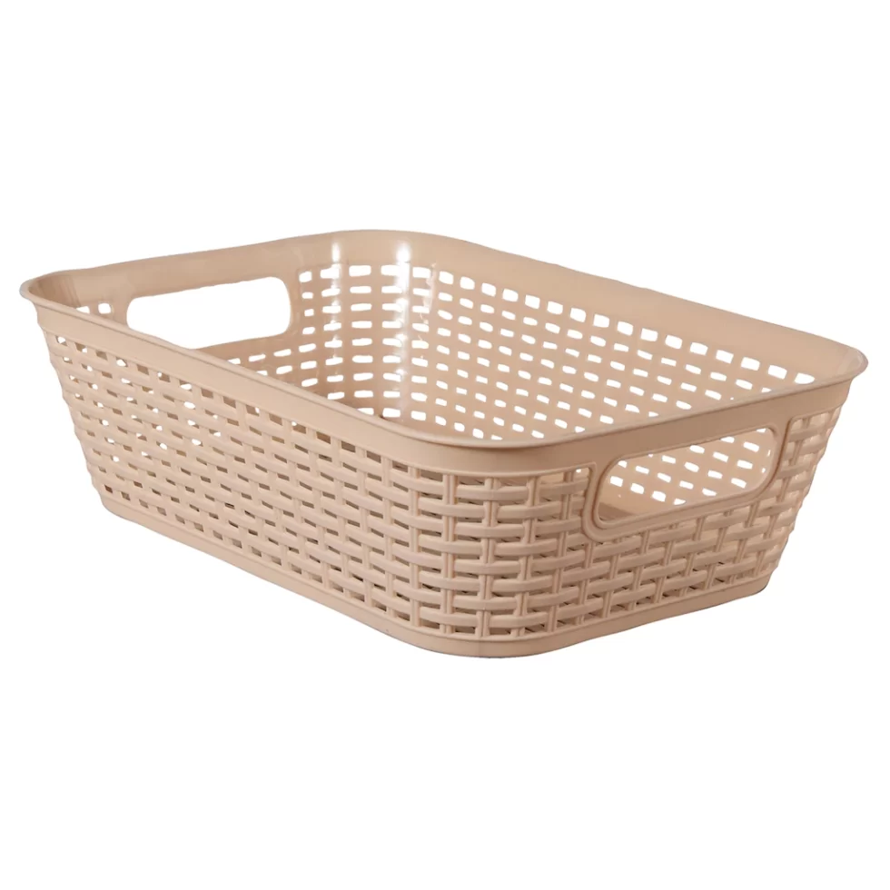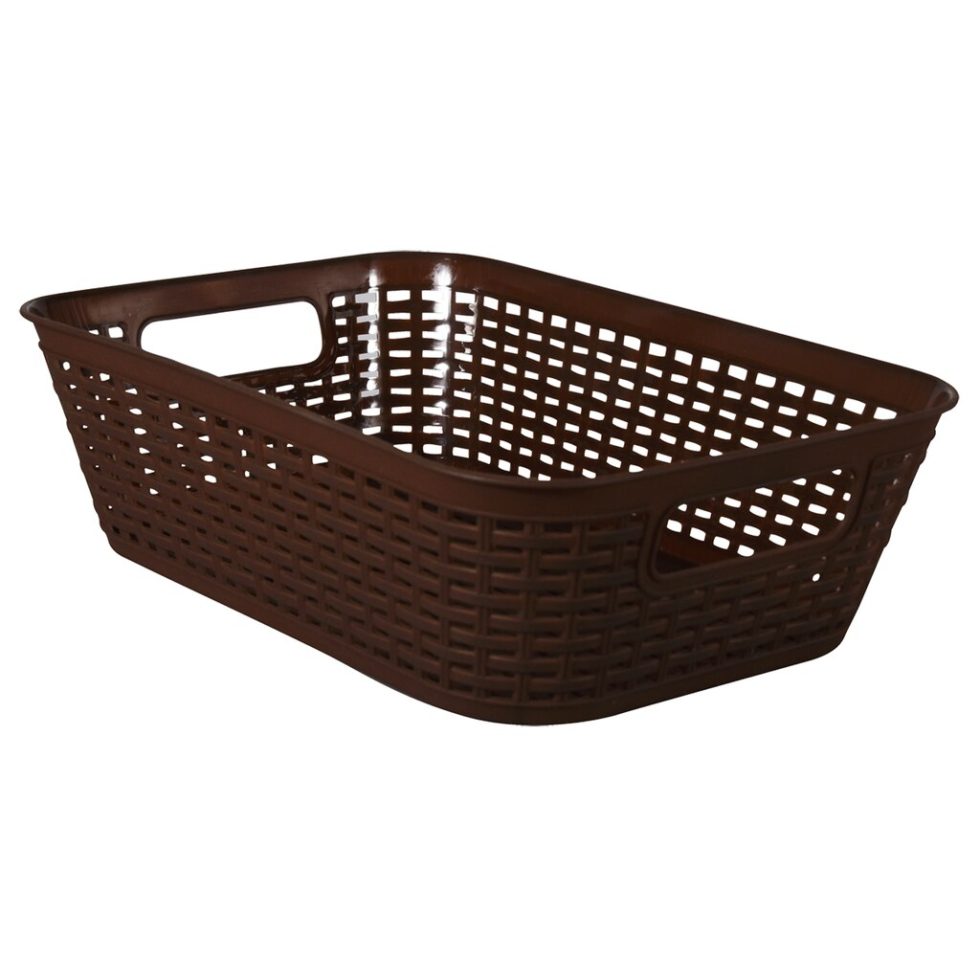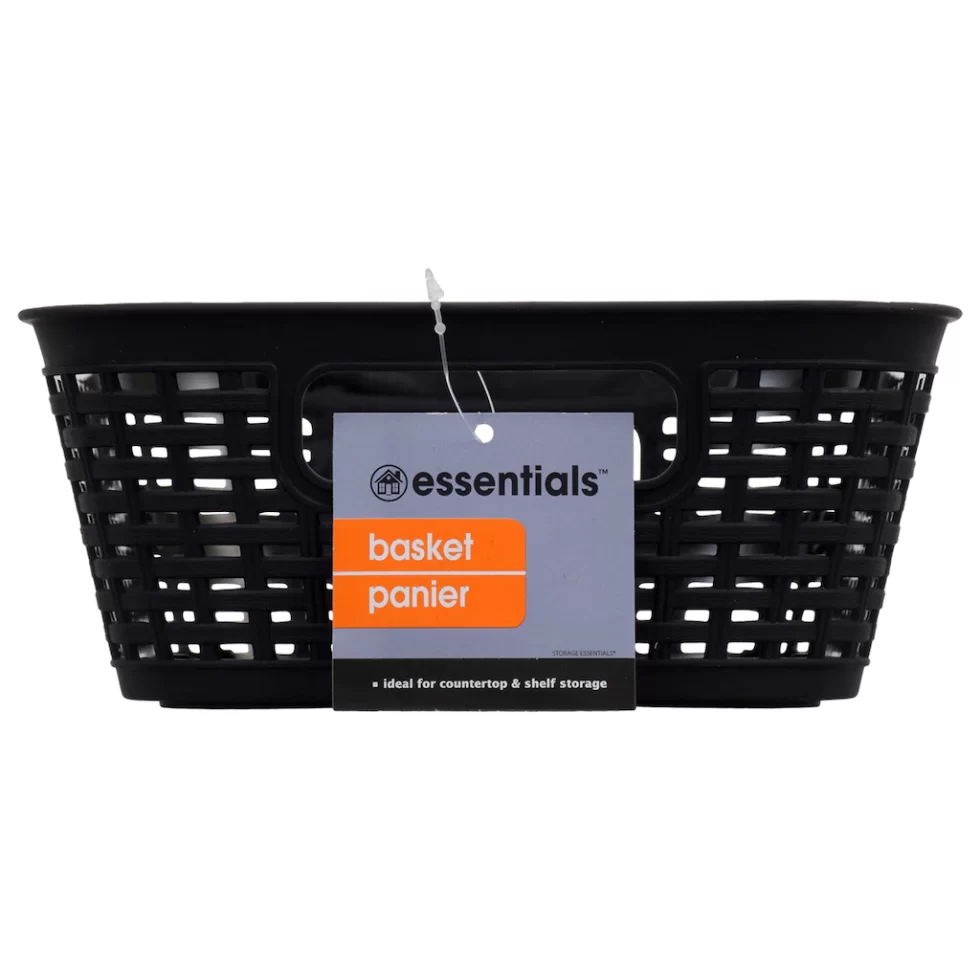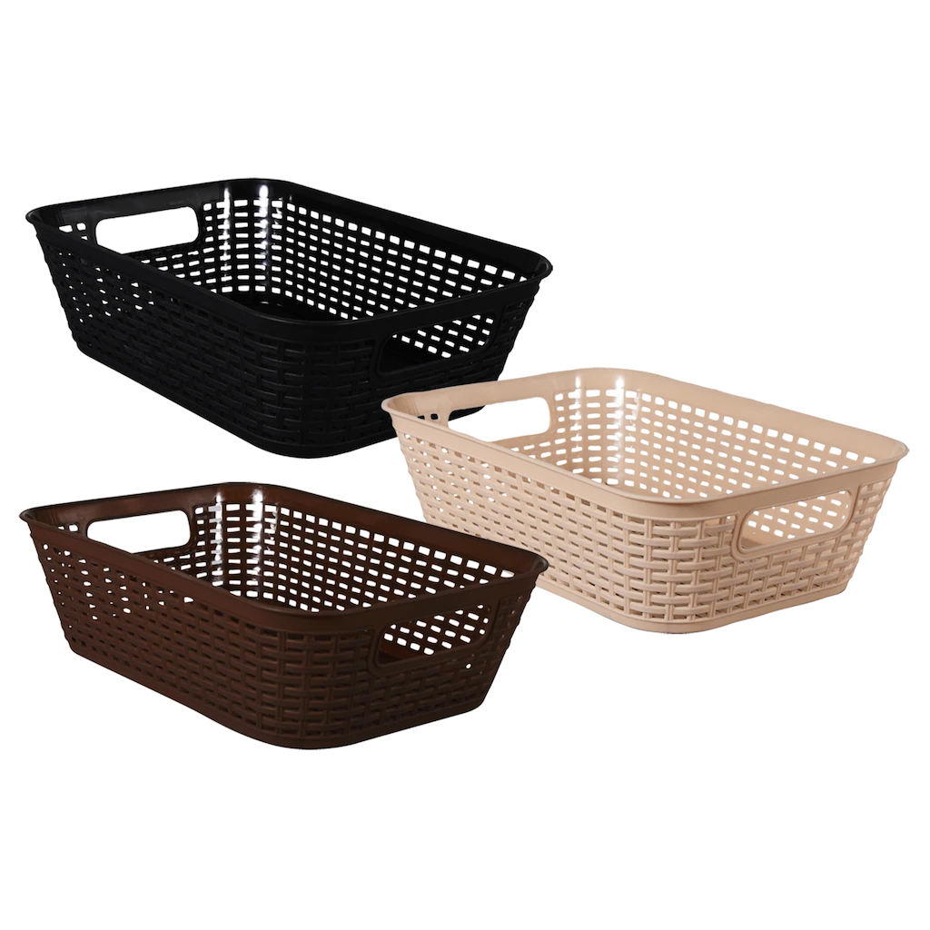 Assortment Details: 11.75x8x3.5-in. Essentials® Rectangular Slotted Plastic Baskets assorted among brown, black, and beige.