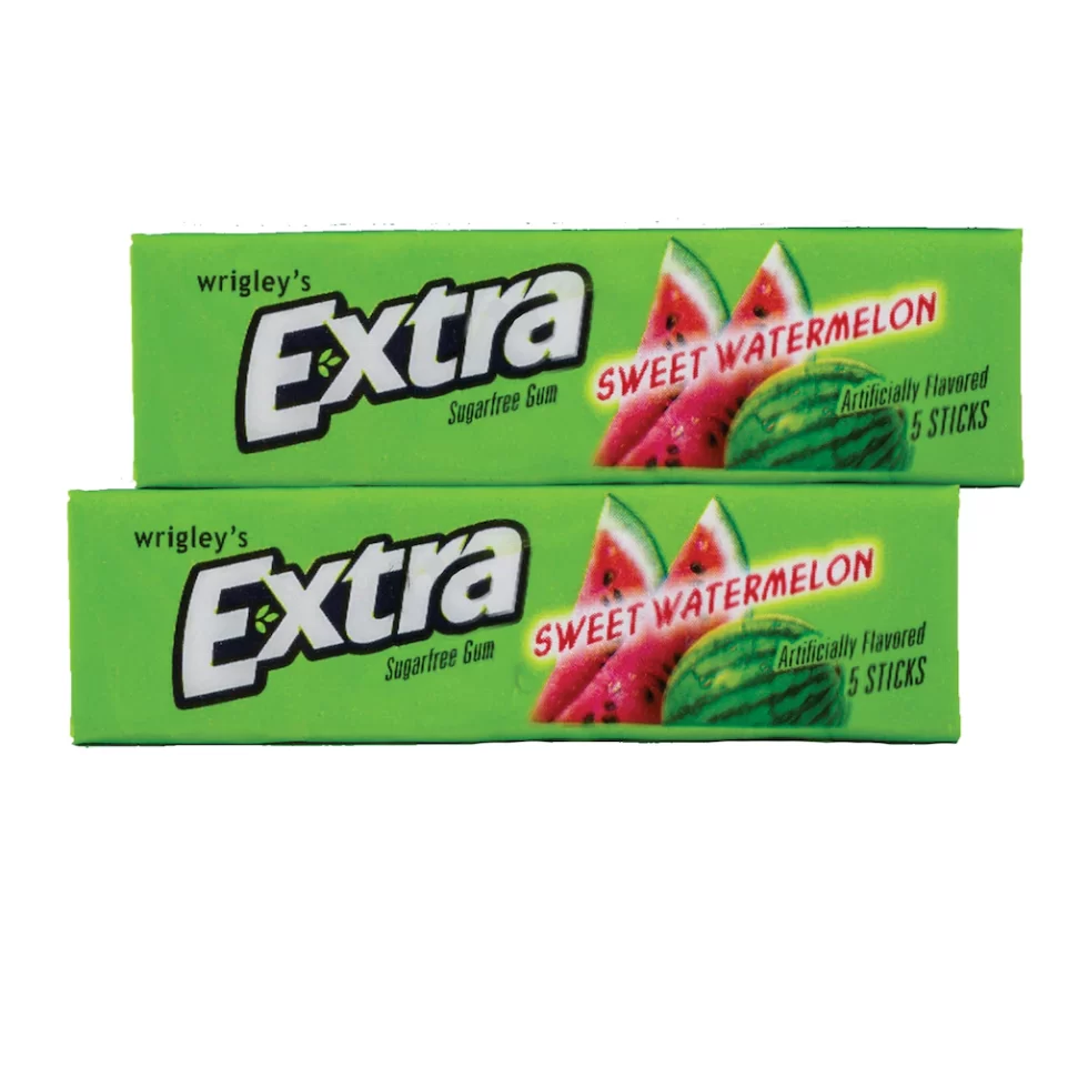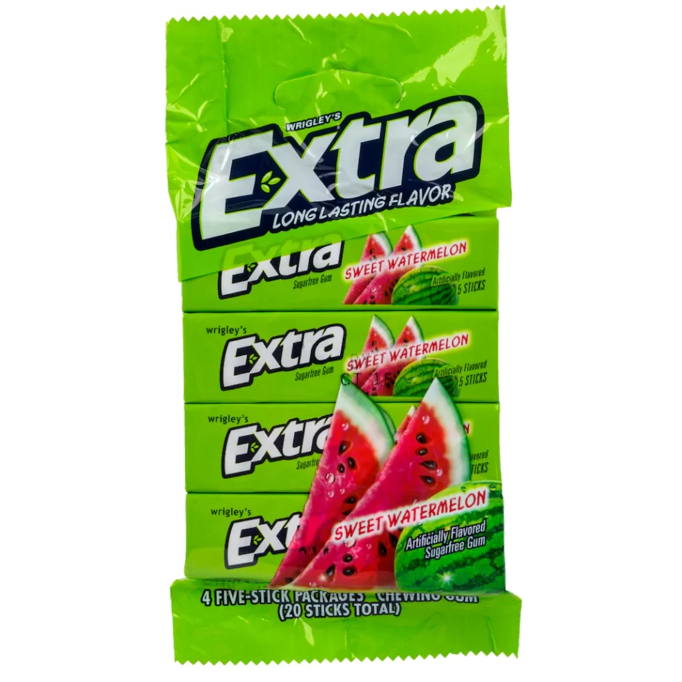 Extra� watermelon gum is sugar free and helps fight cavities by reducing plaque acids and strengthening teeth when chewed for 20 minutes after eating. Plus it has a long-lasting fruity flavor! Each pack contains 5 sticks of gum. Great for goodie bags, conferences, and resale in convenience stores.