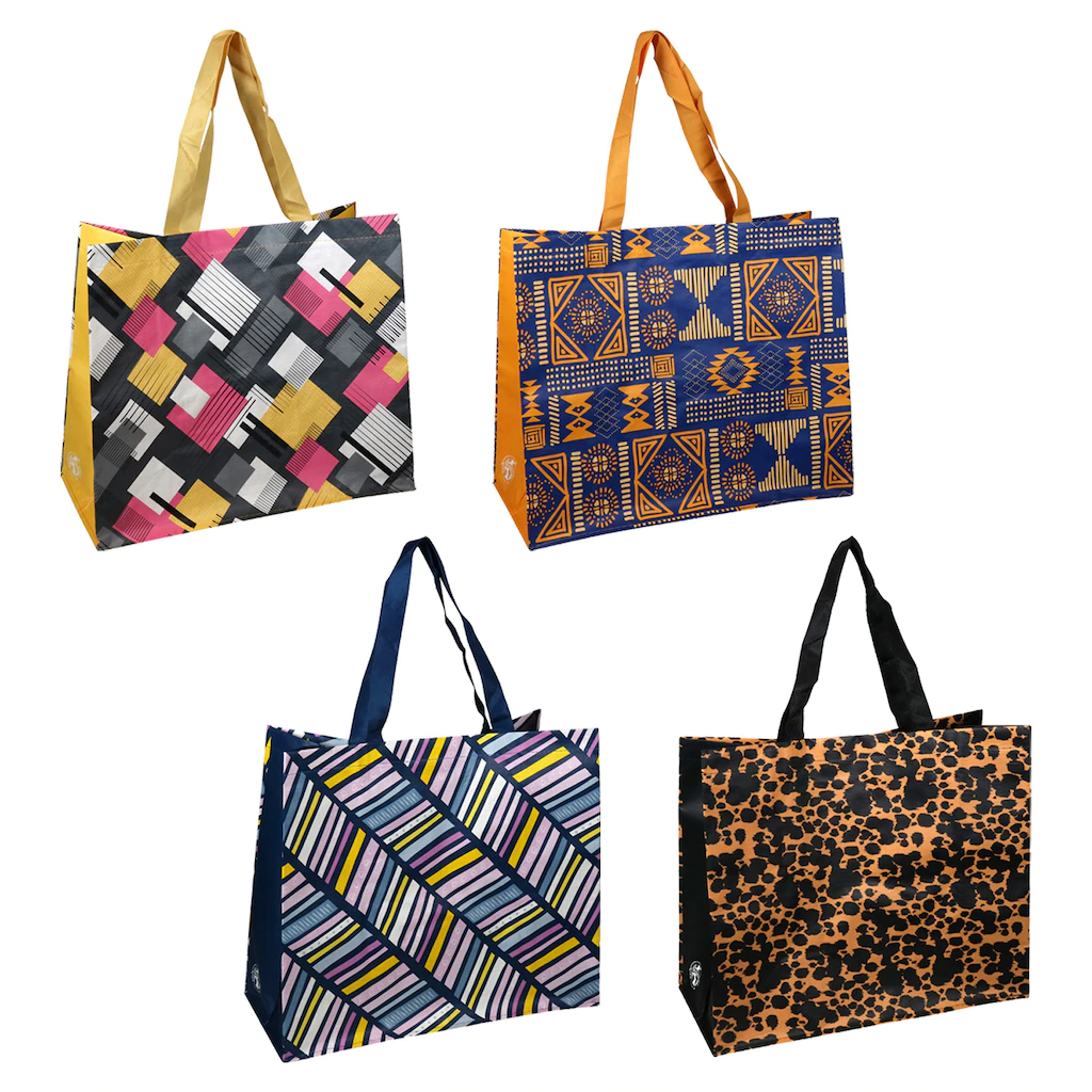 Assortment Details: 13.75×15.75×7.375-in. Extra Large Color Printed Reusable Tote Bags assorted among the 4 designs shown