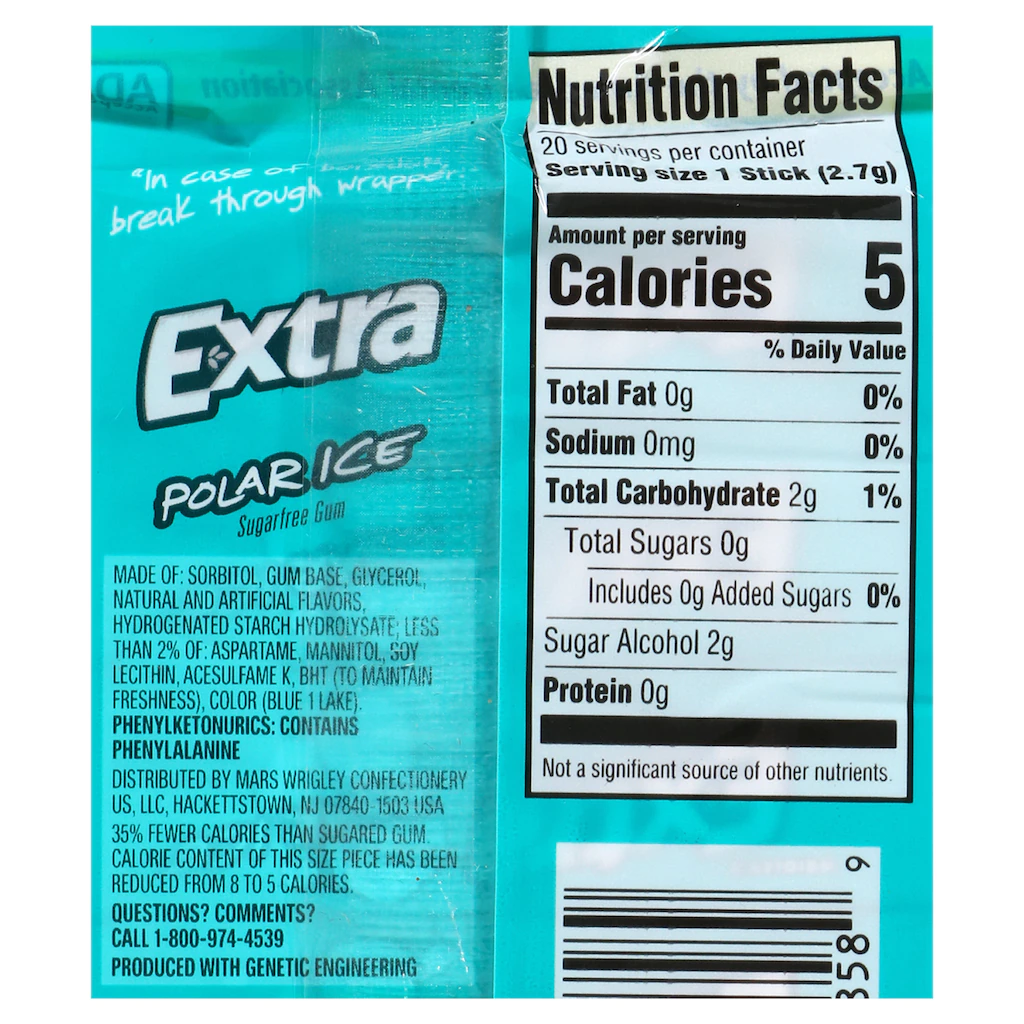 Extra Polar Ice gum is sugar free and helps fight cavities by reducing plaque acids and strengthening teeth when chewed for 20 minutes after eating. Accepted by the American Dental Association.