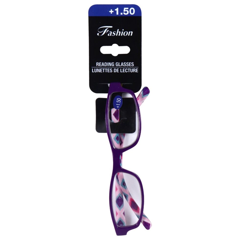 Assortment Details: Fashion Readers, 1.50 Diopter, assorted among black, lavender, light beige, and 2 reds with different temple patterns as shown
