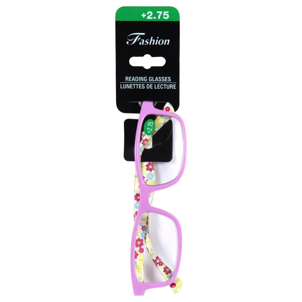 Assortment Details: Fashion Readers, 2.75 Diopter, Assorted among black with black temple, red, lavender, dark blue, and black with patterned temple