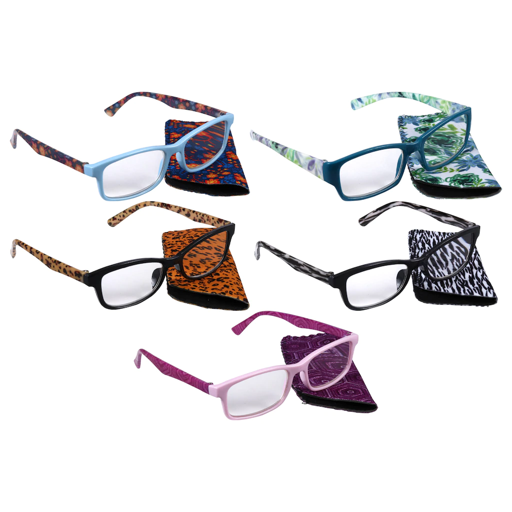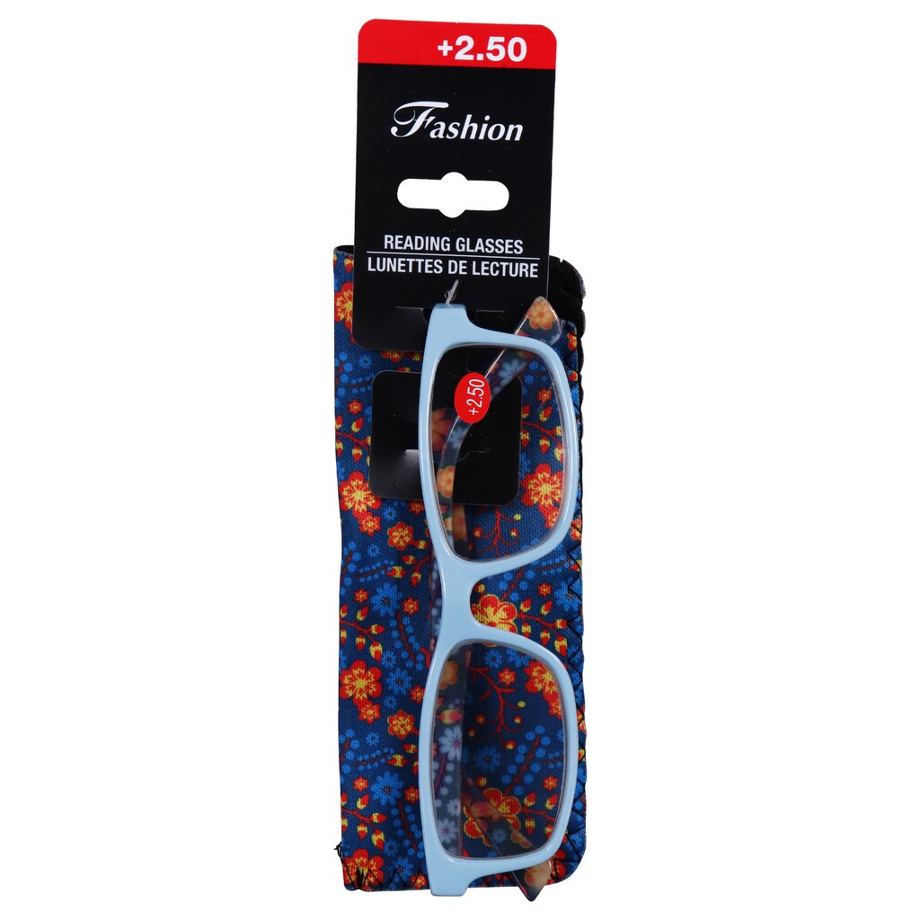 Enjoy the celebrated colors represented in our fashion readers with 2.50 magnification strength! They have fashion color frames and coordinating patterns on the temples. Included with each pair is a pouch that matches the temple pattern. Coordinate every outfit and leave a pair anywhere you may need them: in the living room, the kitchen, the bathroom, the bedroom, the craft or sewing room, in your desk at work, and in your car. Bring a few into meetings for those who’ve forgotten or lost their glasses. Add them to care packages or donate directly to shelters. Assortment may vary.