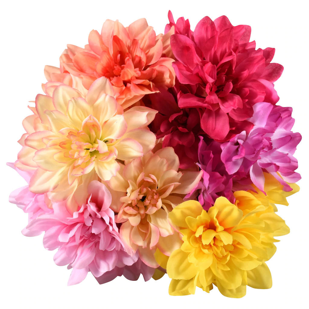 Nothing says summer like a bright bouquet of beautiful dahlias! Great for decorating, centerpieces, crafts, and floral arrangements, plus the wired stems let you bend and shape to suit your needs.The colors are assorted among yellow, peach, hot pink, light pink, ivory, and fuchsia.