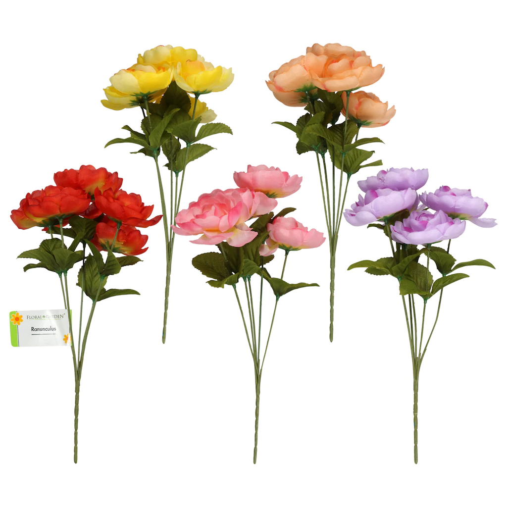 Assortment Details: 13.75×6.125-in. Floral Garden® 6-Stem Artificial Ranunculus Flower Bushes assorted among the 6 colors shown