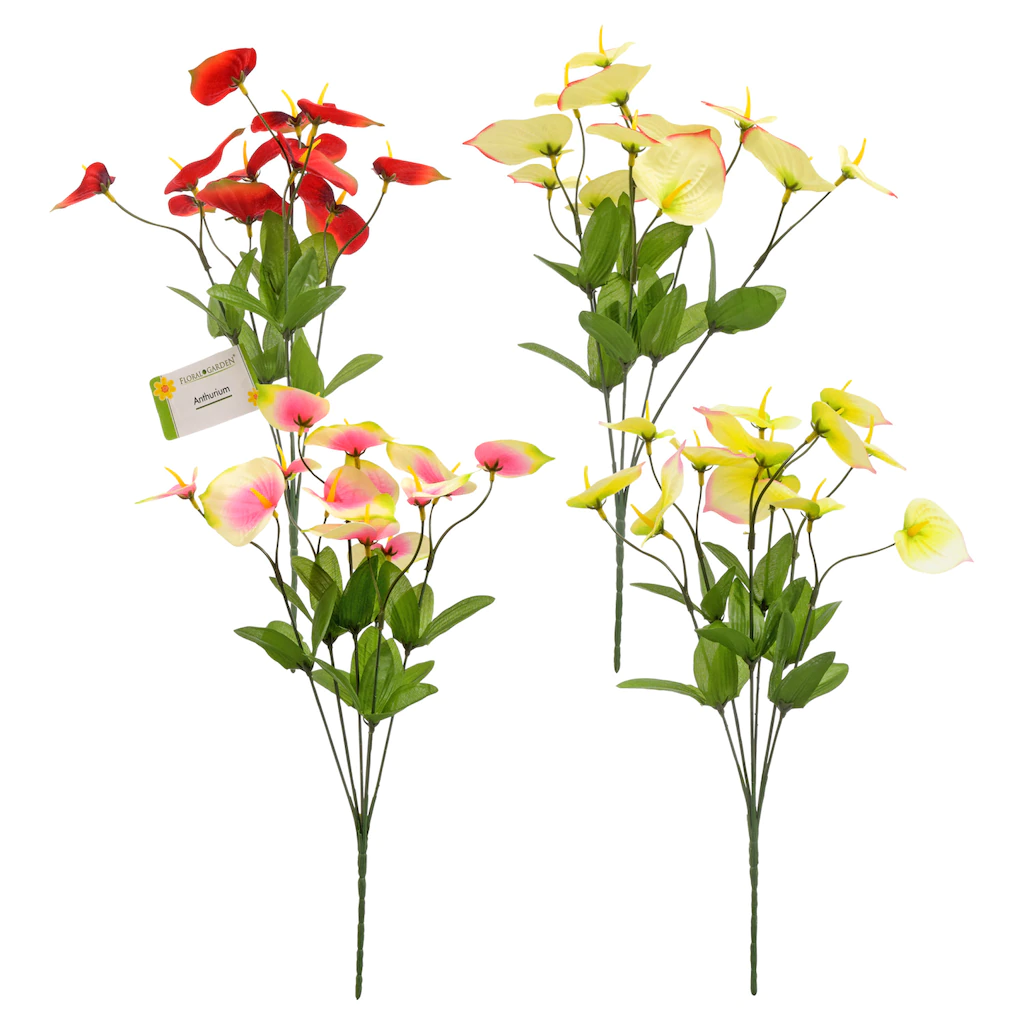 Assortment Details: 13-in. Floral Garden® 6-Stem Mini Anthurium Bushes assorted among red, yellow, pink, and white