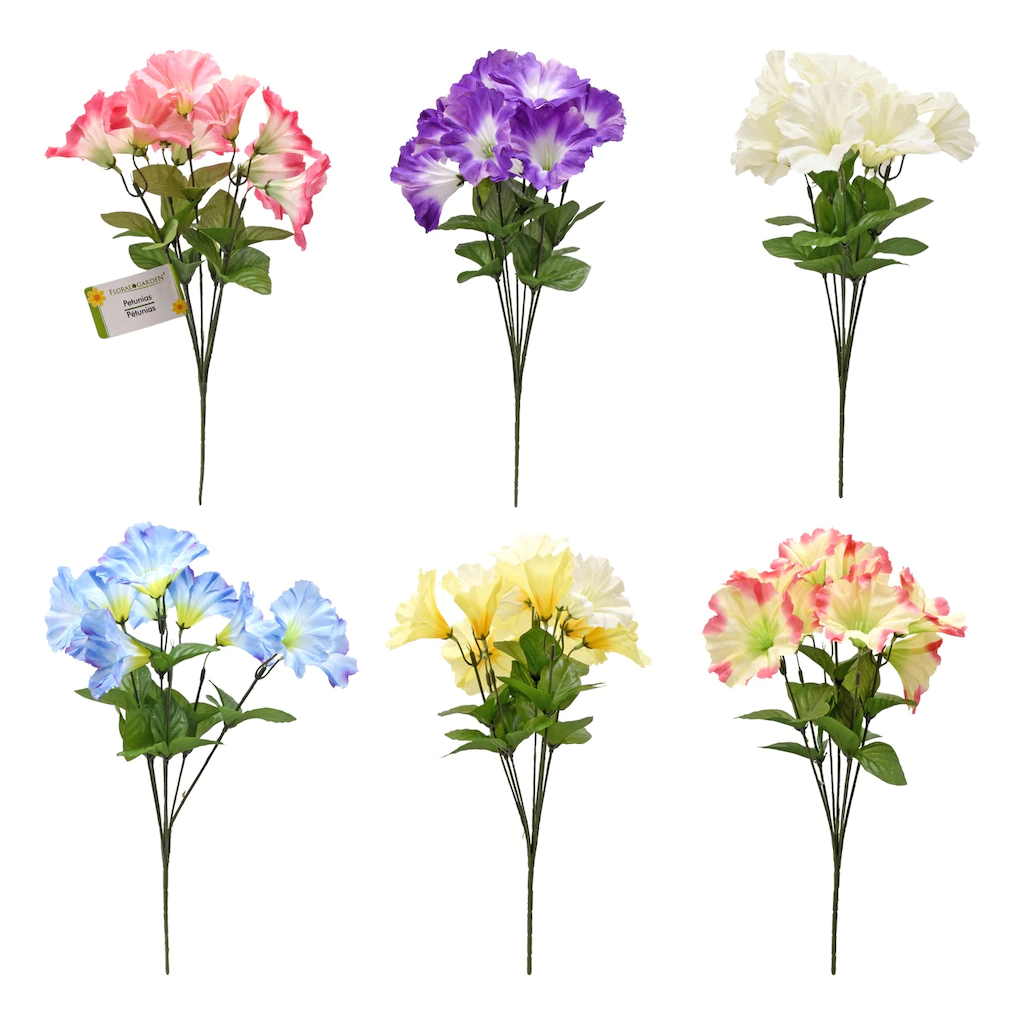 Assortment Details: 12-in. Floral Garden® 7-Stem Spring Petunia Bushes assorted among light pink, purple, white, light blue, yellow, and pink/white