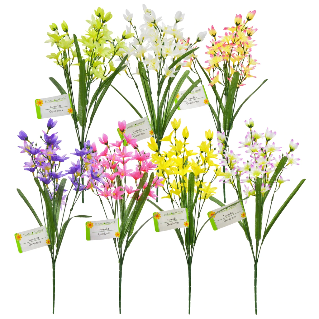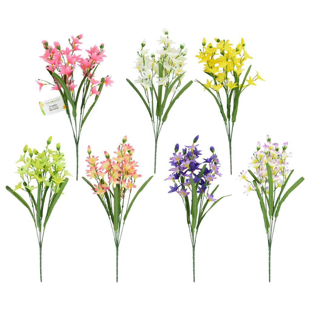 Make gorgeous centerpieces, bouquets, and table arrangements with these faux tweedia bushes. They are assorted among the 7 colors shown. These distinct flowers will have guests in your home, offices, classrooms, and more admiring your creativity.