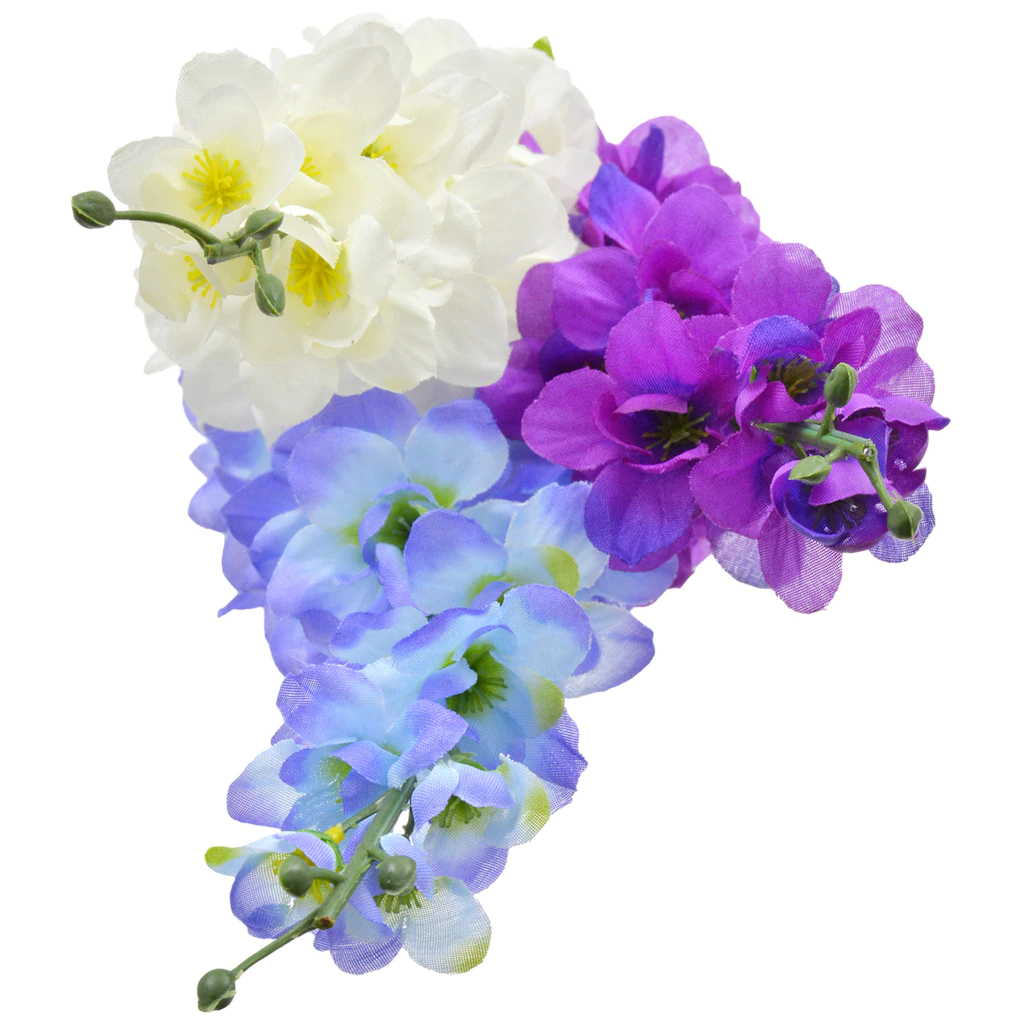 Jump into spring and enjoy the brightness of these colored faux delphinium flowers. Spice up your office with these vibrant colors, add some much needed color to you home during the cold winter. These faux flowers never lose their beautiful shape and come assorted among purple, white, and blue. They are the perfect touch to a table centerpiece, bouquet, and window display.