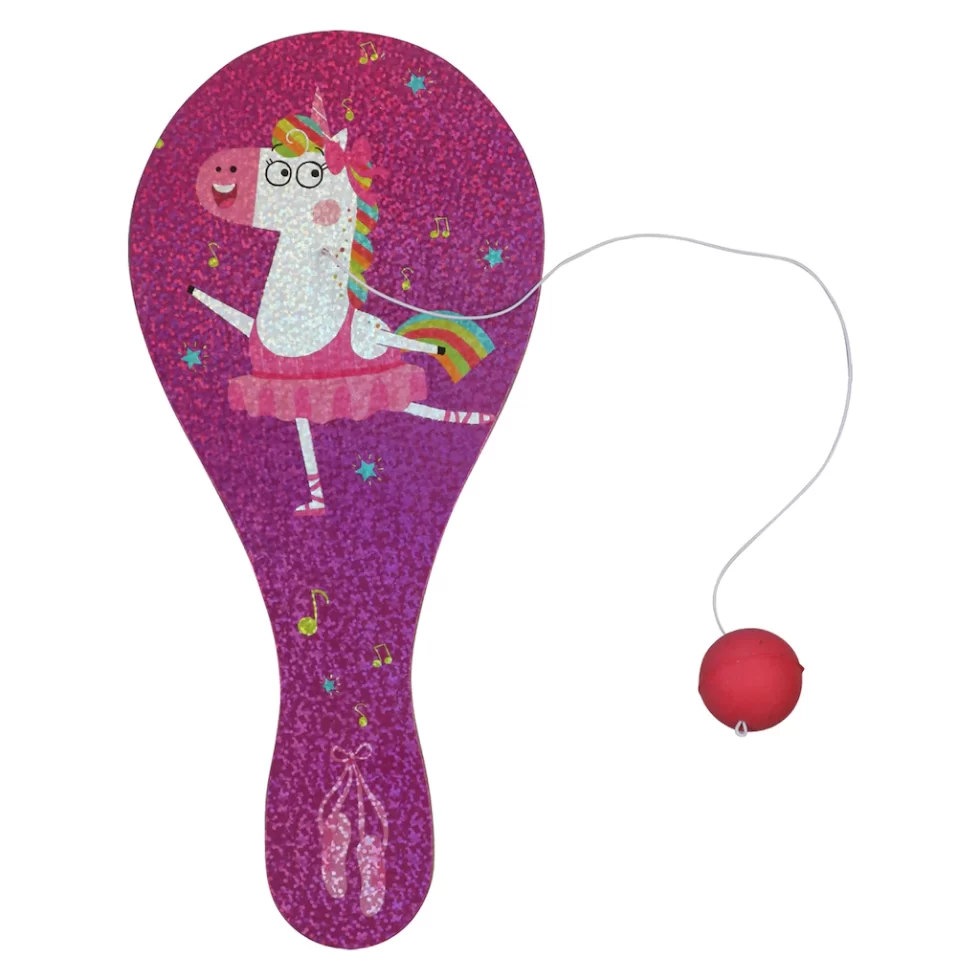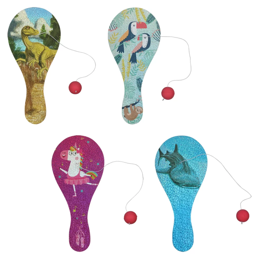 A classic game with a futuristic twist! Durable paddles have fun, bright, laser designs and an attached rubber ball. Paddle boards come assorted among the 4 designs shown and they have a 1-in. dia. rubber ball attached with a 10-in. long elastic string. Great for prize boxes, goodie bags, and party favors. Ages 4+. Assortment may vary.