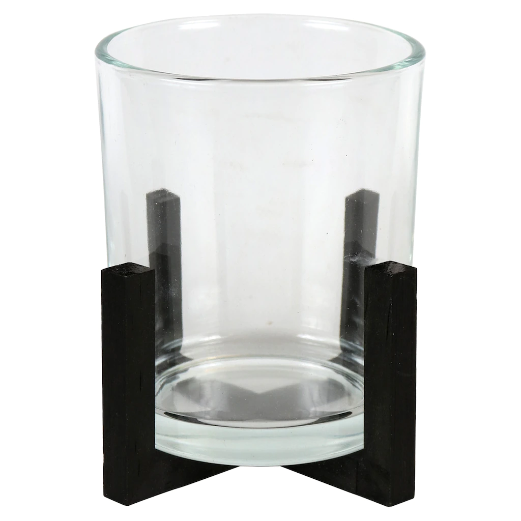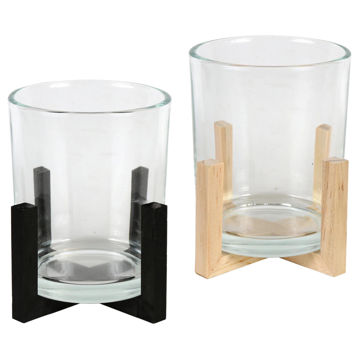 Assortment Details: Glass Candleholders with Wooden Stands assorted between black and natural colored stands