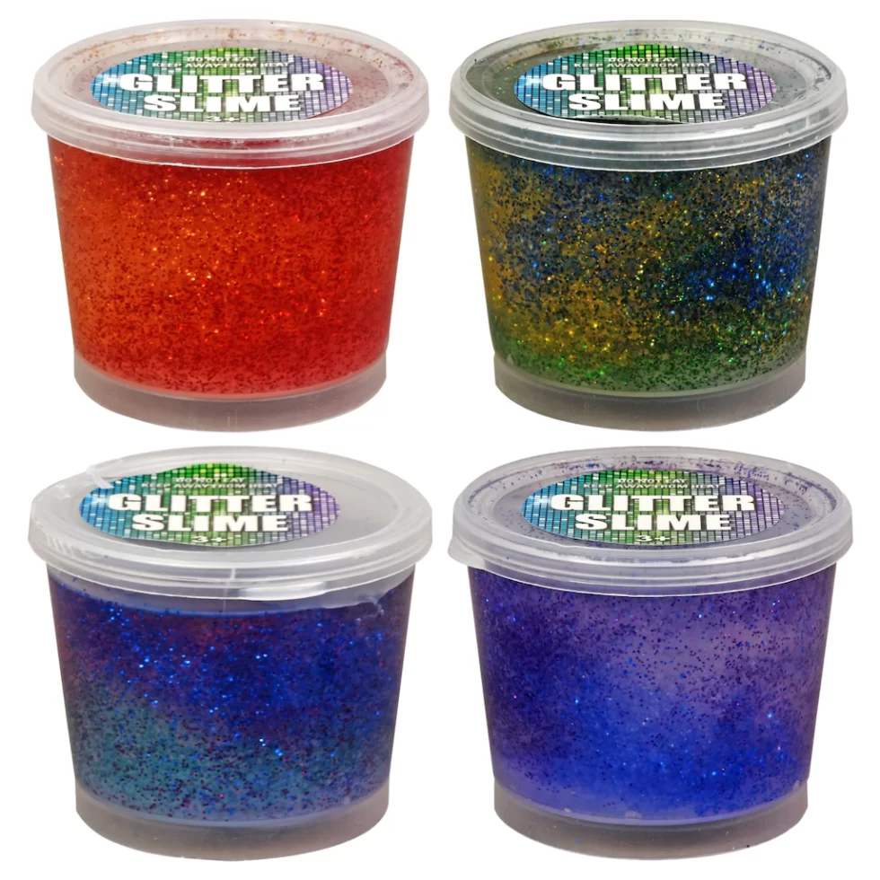 Assortment Details: 2.25×2.75-in. Glitter Play Slime assorted among red, green, purple, and blue