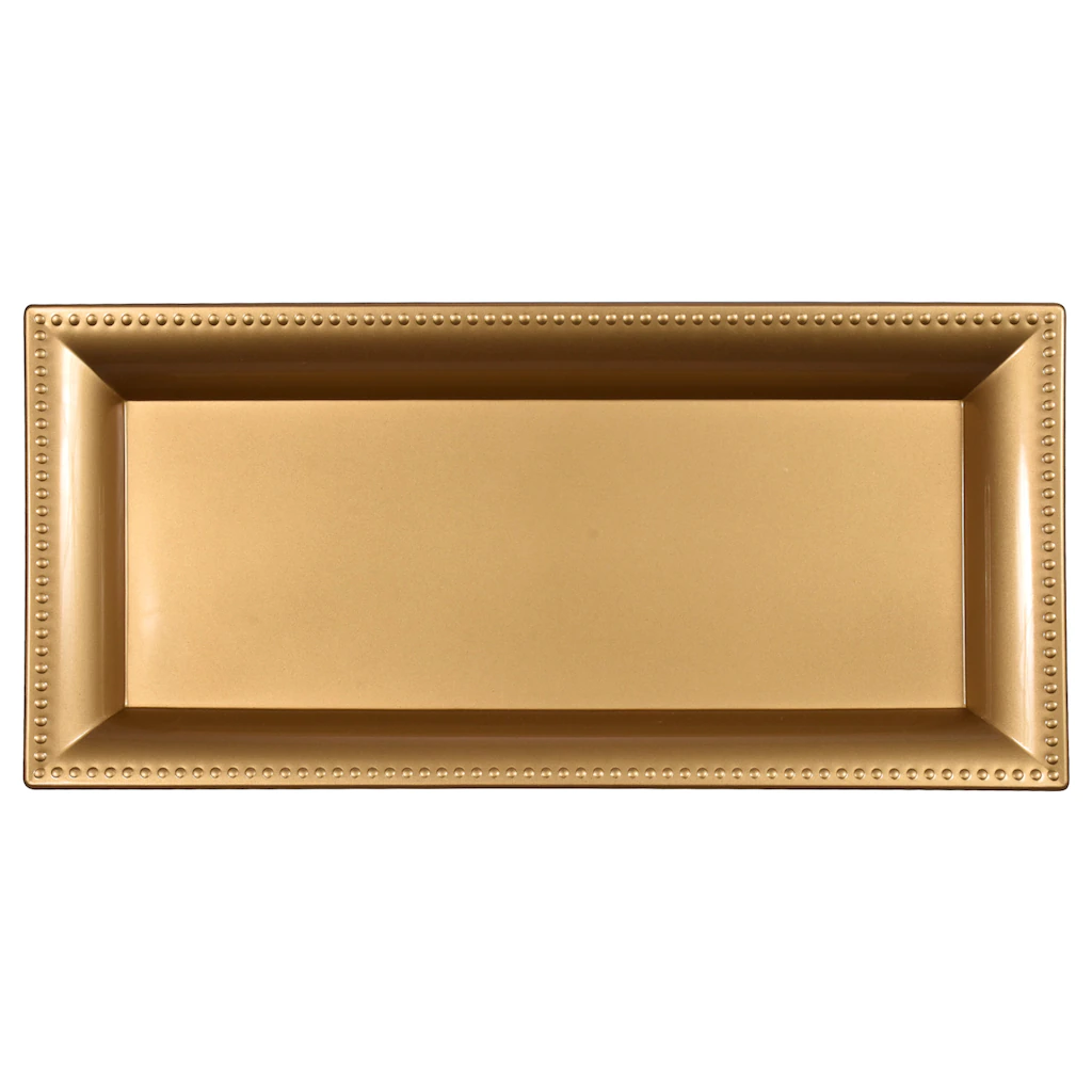 Assortment Details: 14×6.5-in. Gold Rectangular Plastic Charger Trays