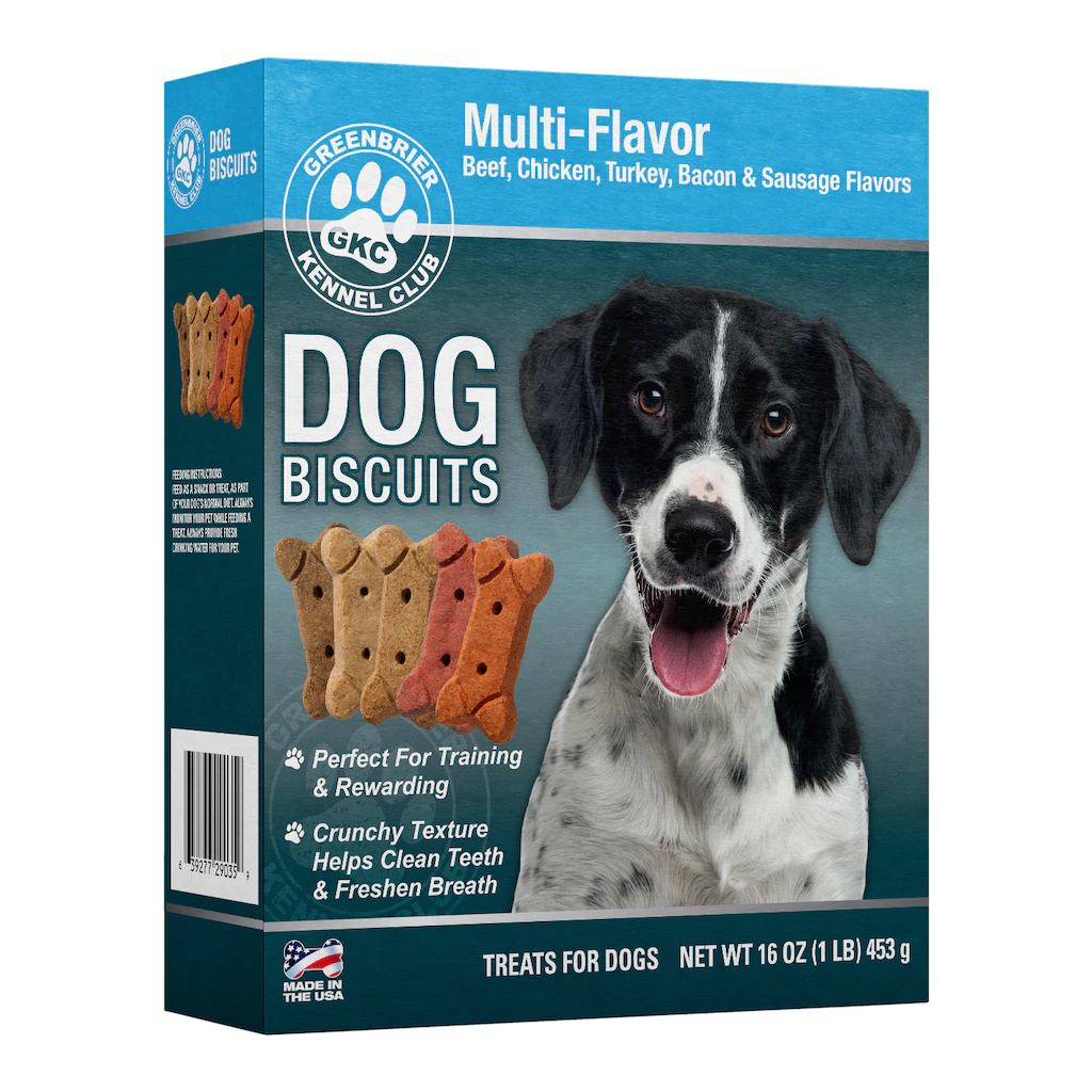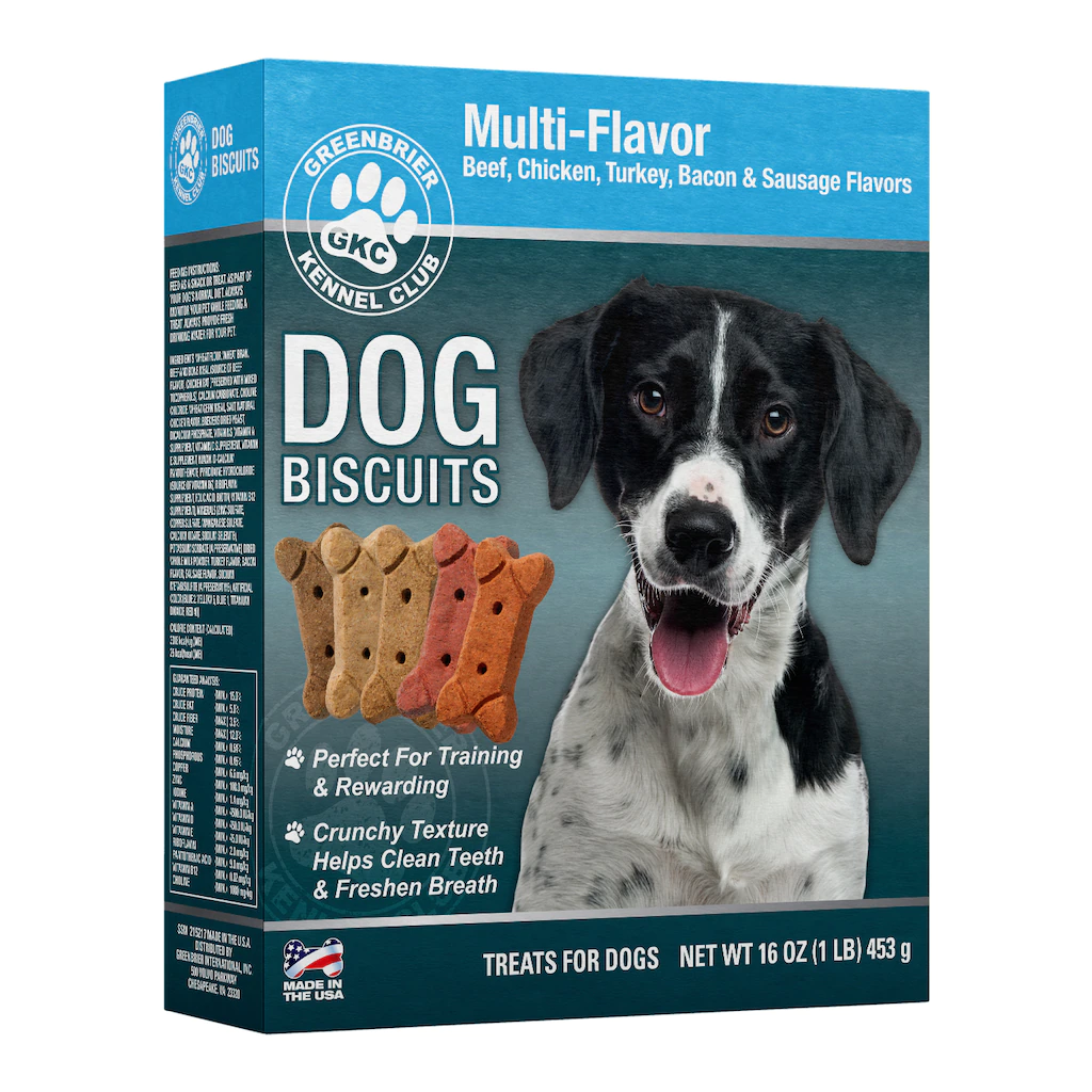 Assortment Details: 16-oz. Bags Greenbrier Kennel Club™ Dog Biscuits Variety Pack includes the flavors beef, sausage, chicken, turkey, and bacon.