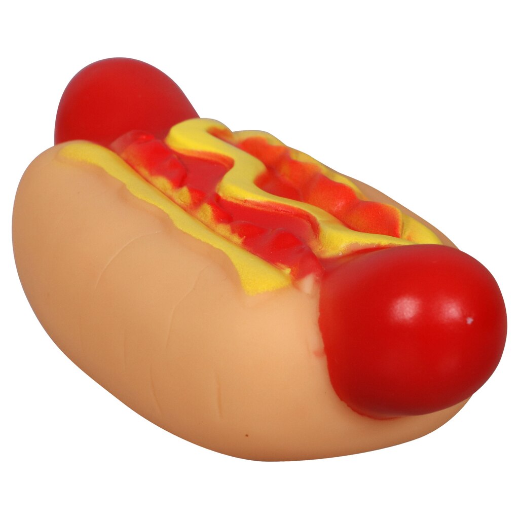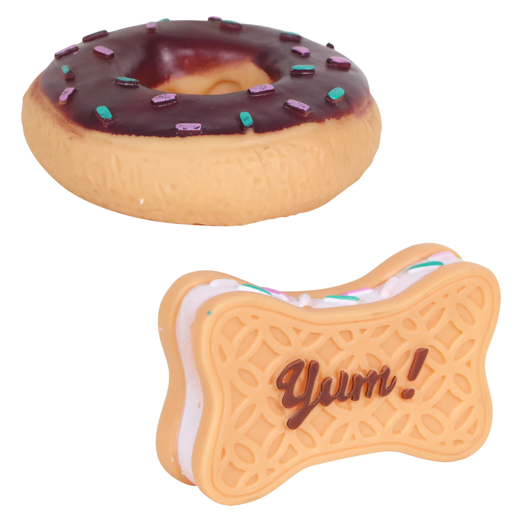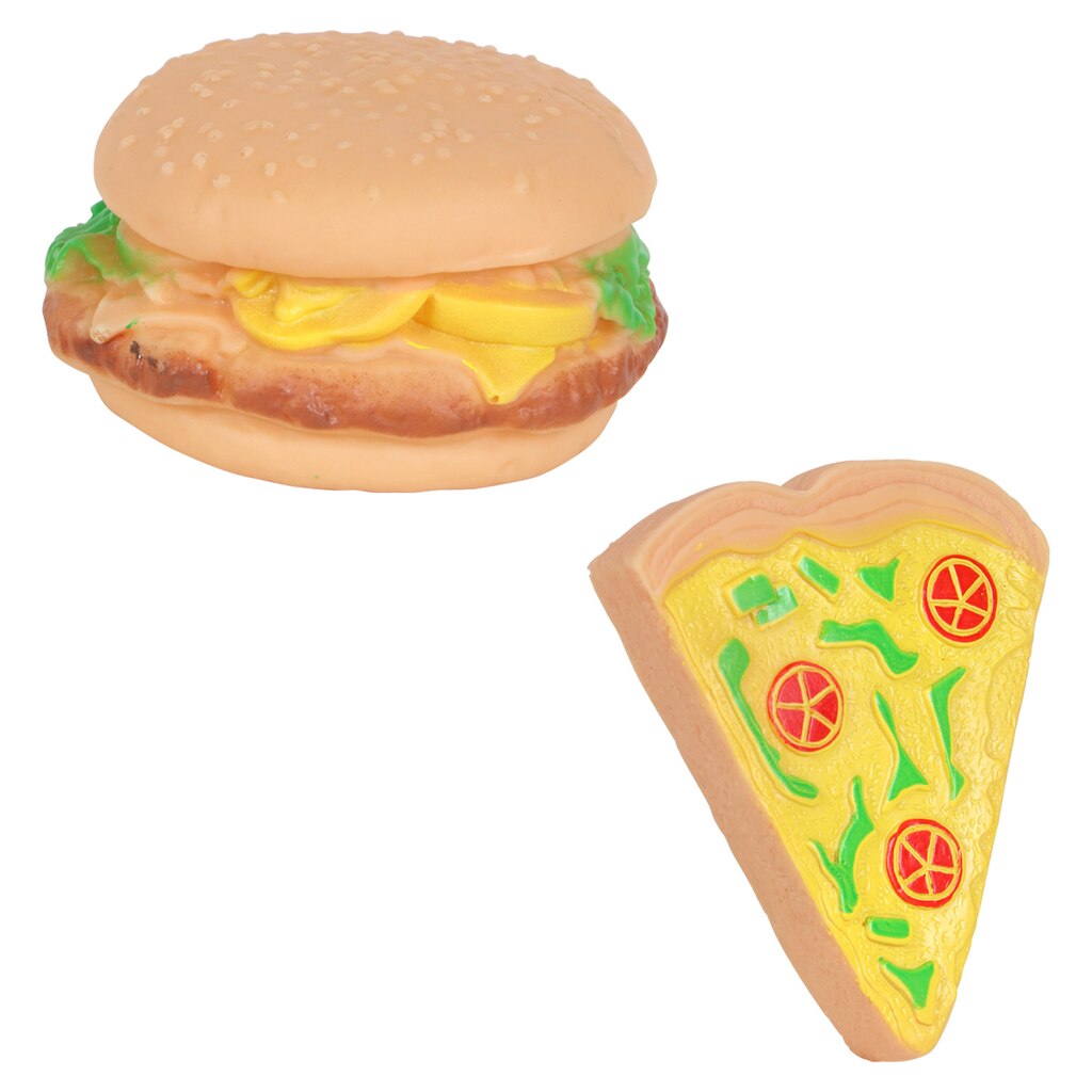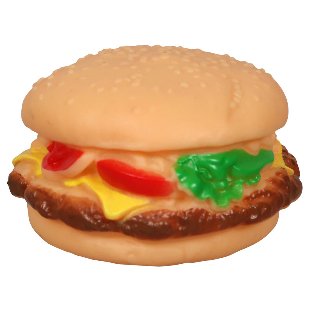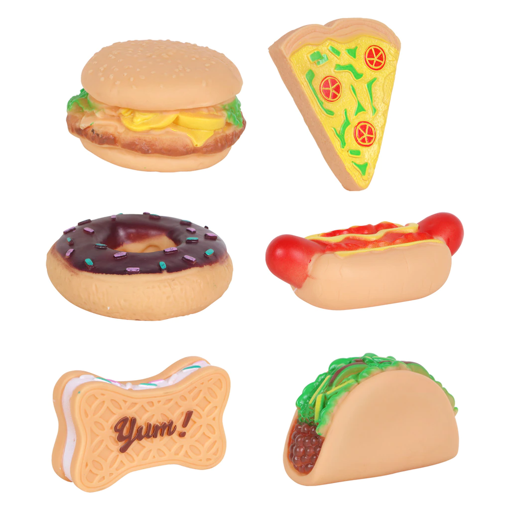 Assortment Details: Greenbrier Kennel Club™ Food-Shaped Vinyl Dog Toys assorted among hamburgers, pizzas, donuts, hot dogs, cookies, and taco shapes