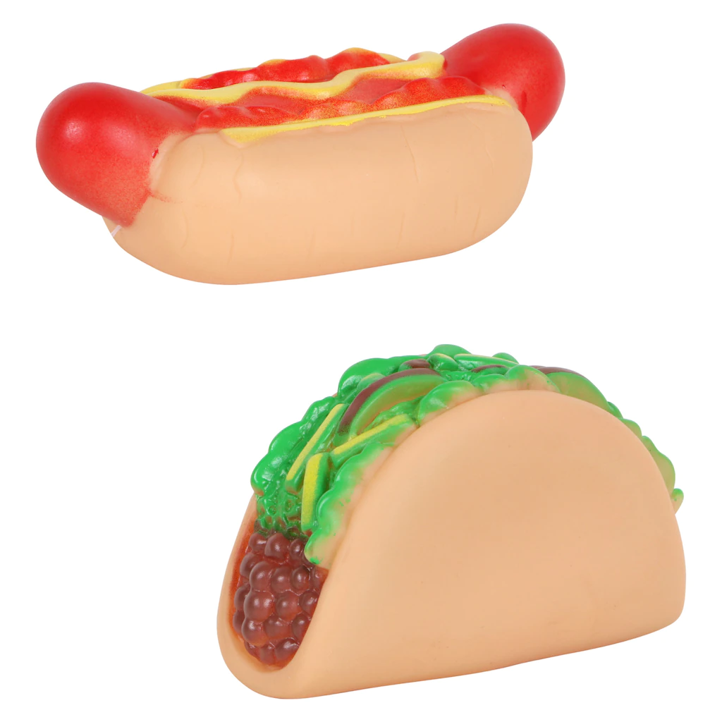 These fun, food-themed chew toys are perfect for playtime and fetch. Sturdy toys come assorted among hamburgers, pizzas, donuts, hot dogs, cookies, and tacos and are designed to entertain any pup. Ideal for home, vets, animals shelters, and donations.