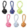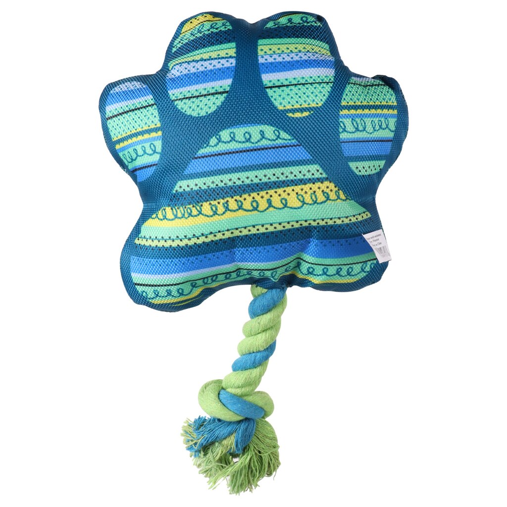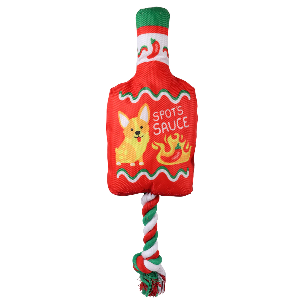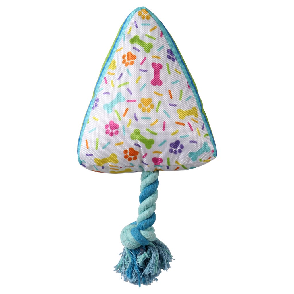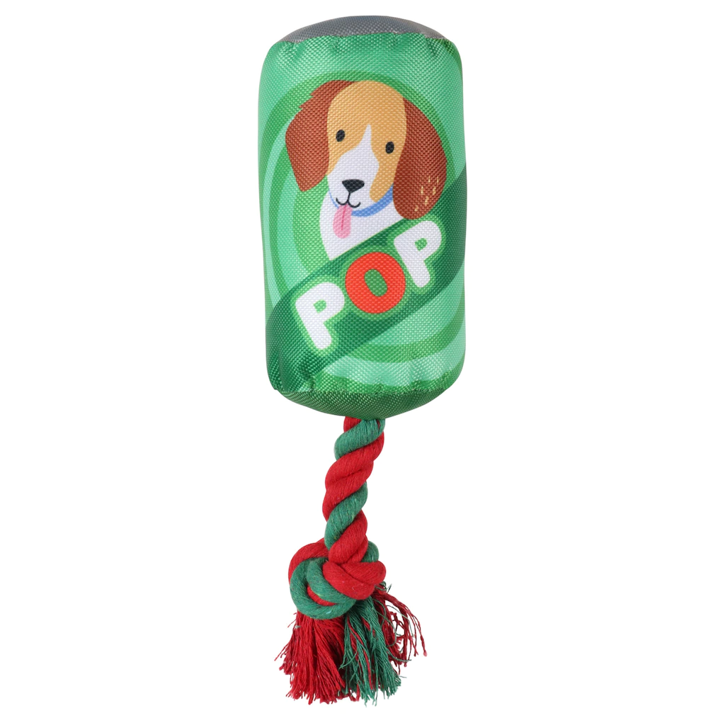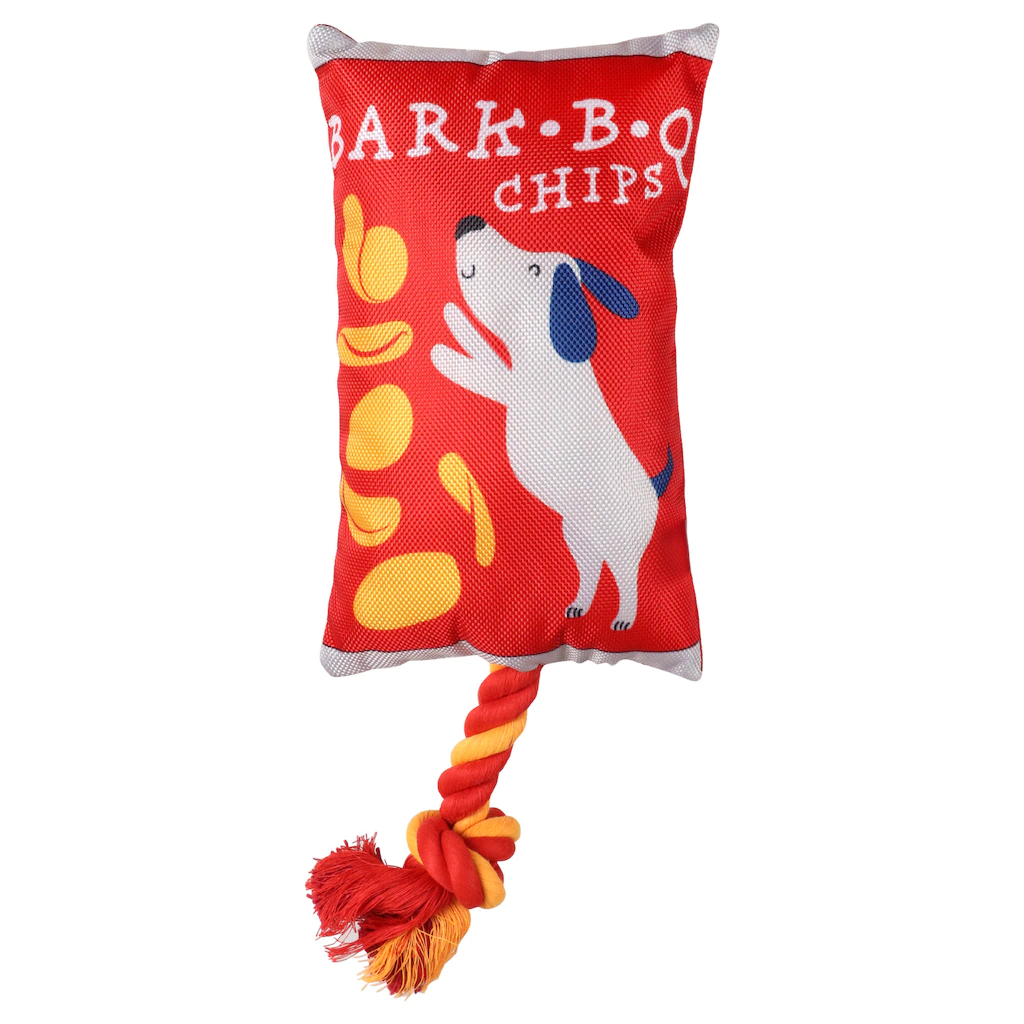 Your dog will love playing with these colorful squeaky toys! These nylon and plush toys have 4-in. attached ropes with knots at the ends and come in six food-inspired designs or vibrant patterns: printed triangle-shaped toys, printed doughnut-shaped toys, printed paw-shaped toys, rectangle-shaped toys reading “Bark-B-Q Chips,” can-shaped toys reading “Pop,” and bottle-shaped toys reading “Spots sauce.” Great for entertaining your pup and playing tug! Assortment may vary.