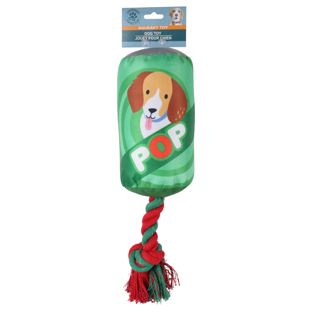 Assortment Details: Greenbrier Kennel Club™ Shaped Squeaky Dog Toys with attached Ropes assorted among printed triangle-shaped toys, printed doughnut-shaped toys, printed paw-shaped toys, rectangle-shaped toys reading “Bark-B-Q Chips,” can-shaped toys reading “Pop,” and bottle-shaped toys reading “Spots sauce.” Assortment may vary.