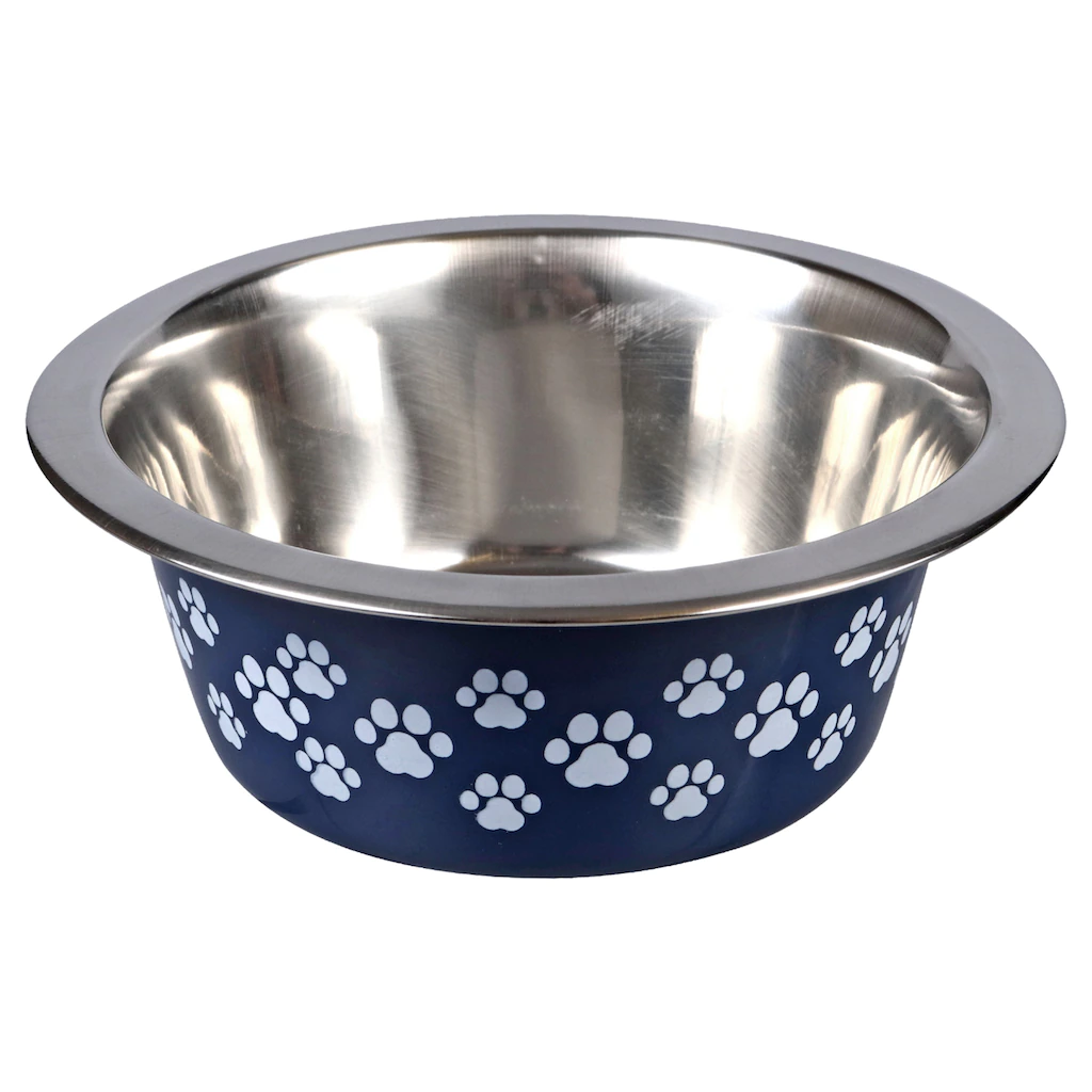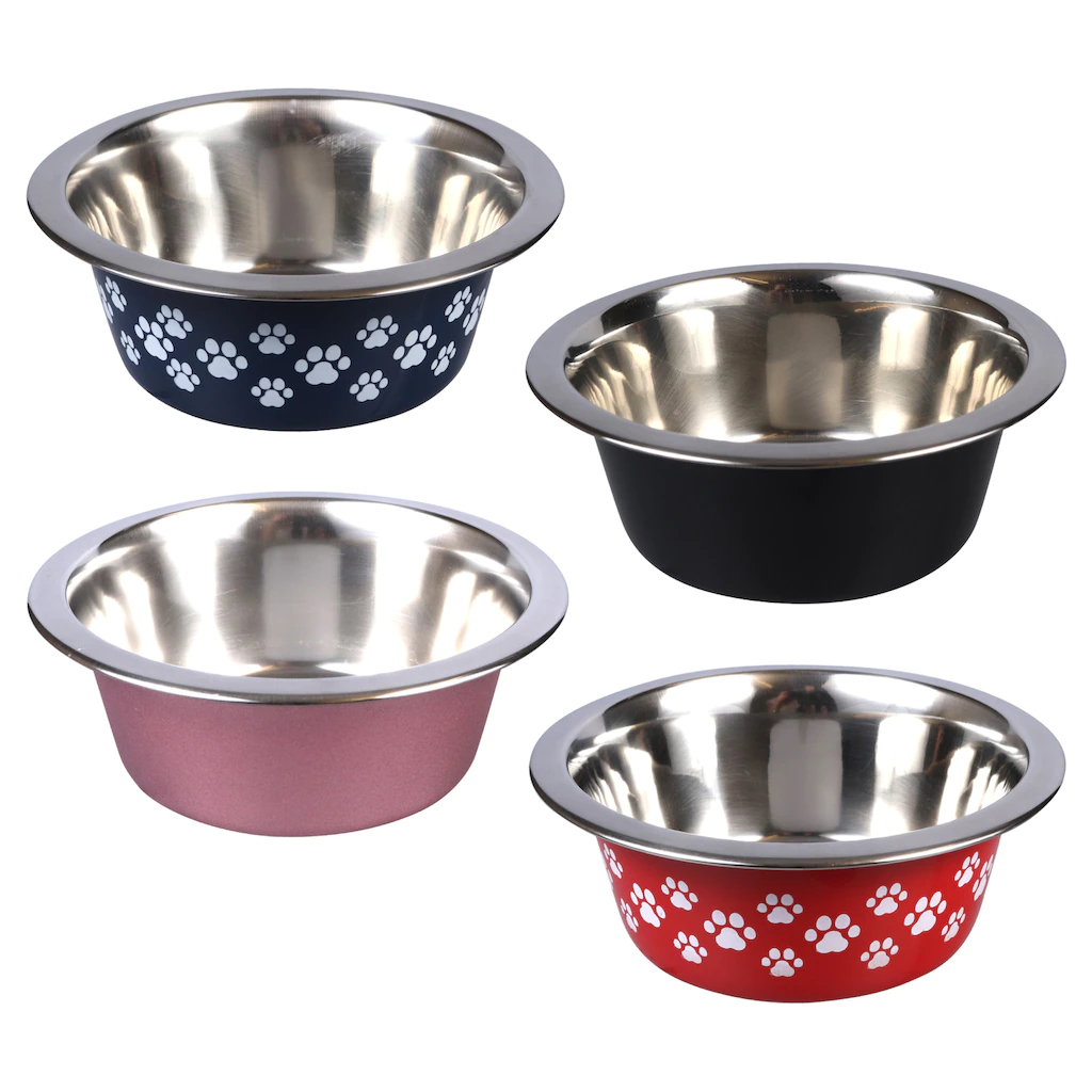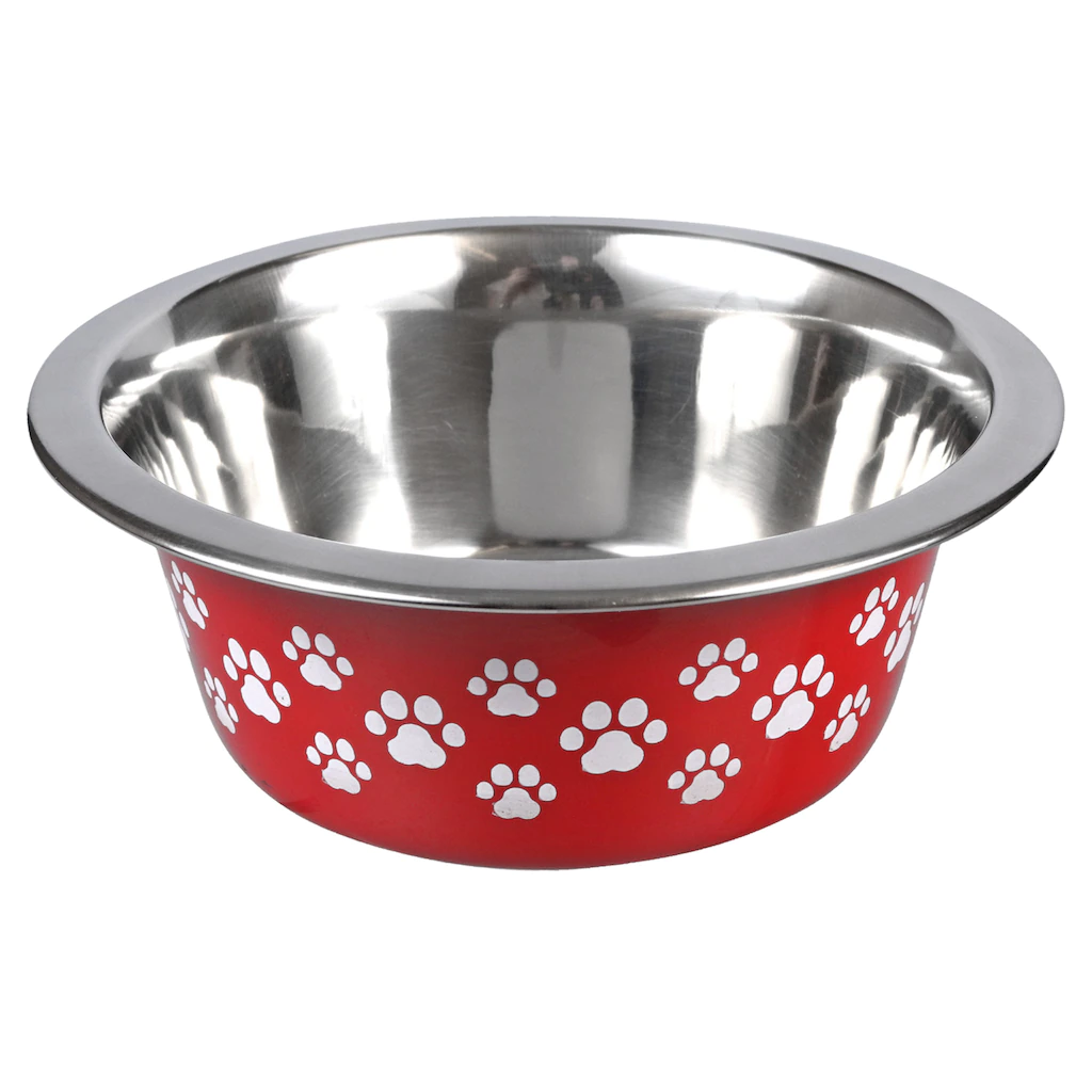 Adorable paw prints and bold colors decorate these sturdy stainless-steel pet bowls. Assorted among copper, black, navy blue with paw prints, and red with paw prints each bowl measures 6.625×2.625-in. Ideal for animal shelters, your home, large-breed rescues, pet supply stores, dog groomers, and more.