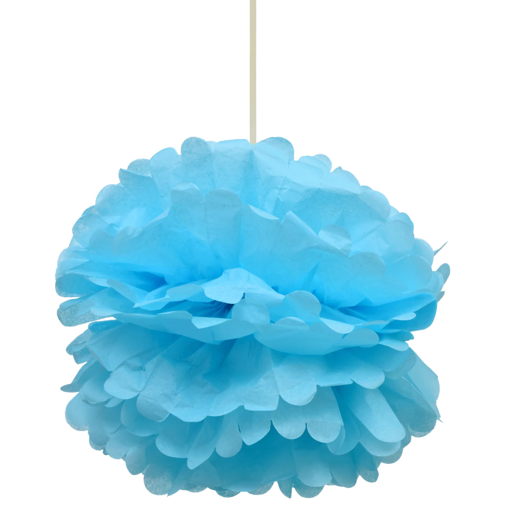 Hanging tropical light blue pom-poms add a bright decorative accent to any room or event. Each 2-ct. pack contains pom-poms that measure 12-in. diameter and add a pop of color to birthday parties, graduation events, showers, weddings, dorm rooms, and classrooms.