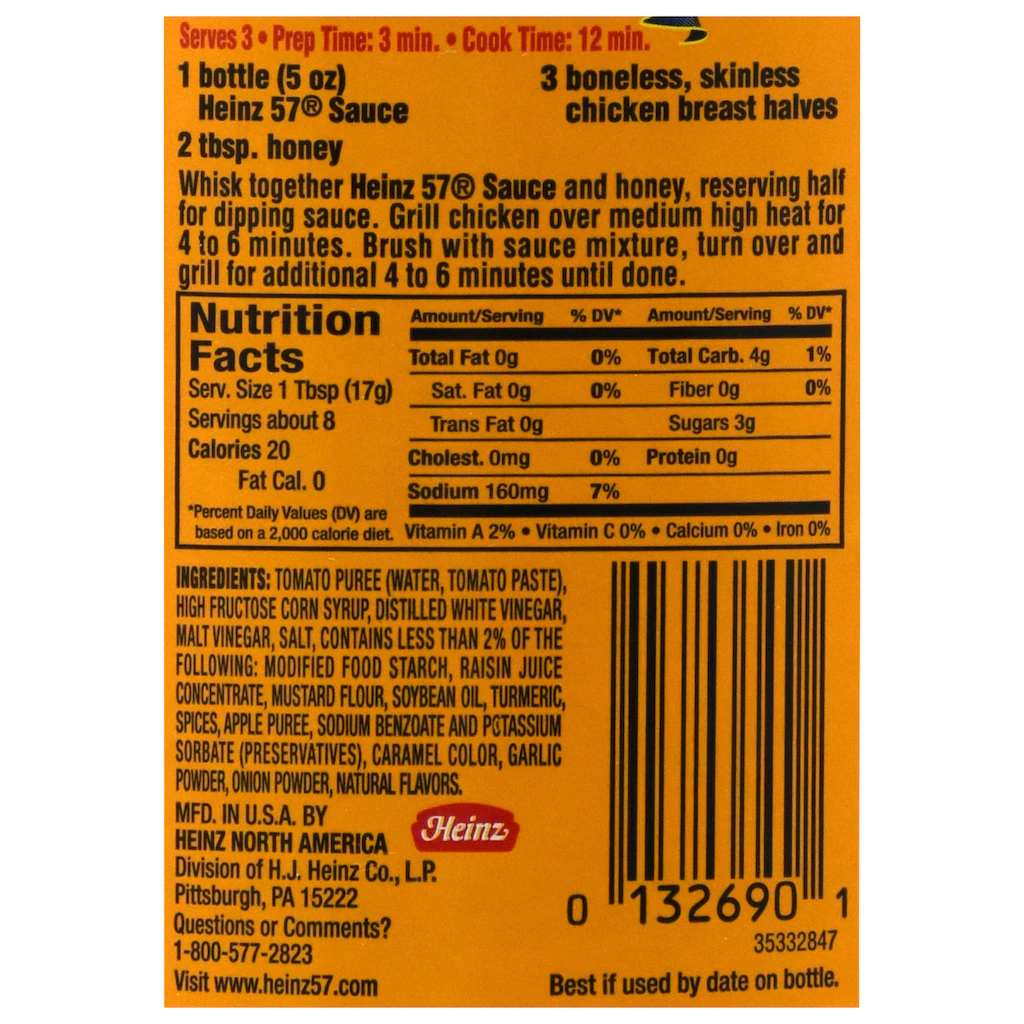 Add zest to your chicken, steak, or pork with Heinz 57® Sauce! Perfect for marinating, grilling, and dipping, this Heinz 57 Sauce comes in 5-oz. bottles and is sure to complement any dish. Perfect for restaurants, cafeterias, caterers, cookouts, picnics, and more.