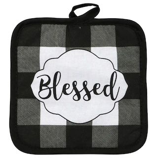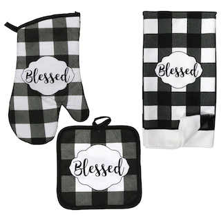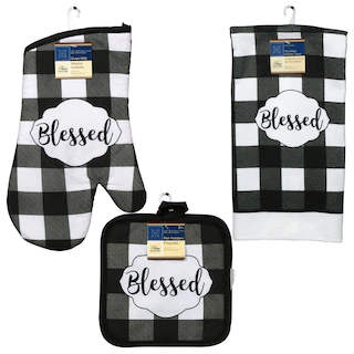 Traditionally beautiful, these buffalo check polyester kitchen linens by Home Collection™ are a stylish addition to any kitchen. The collection is printed with the word “Blessed” and all of the linens that coordinate well with any kitchen design. Perfect for restaurants, cafeterias, home kitchens, and for gift shops. Also great for housewarming parties or wedding gifts! Purchase a full case of 24 and receive 12 – 15×25-in. kitchen towels, 6 – 13×7-in. oven mitts, and 6 – 2-ct. packs of 7×7-in. pot holders. Need just enough for your own kitchen? Order the minimum quantity of 4 units and receive 1 oven mitt, 2 kitchen towels, and 1 – 2-ct. pack of pot holders.