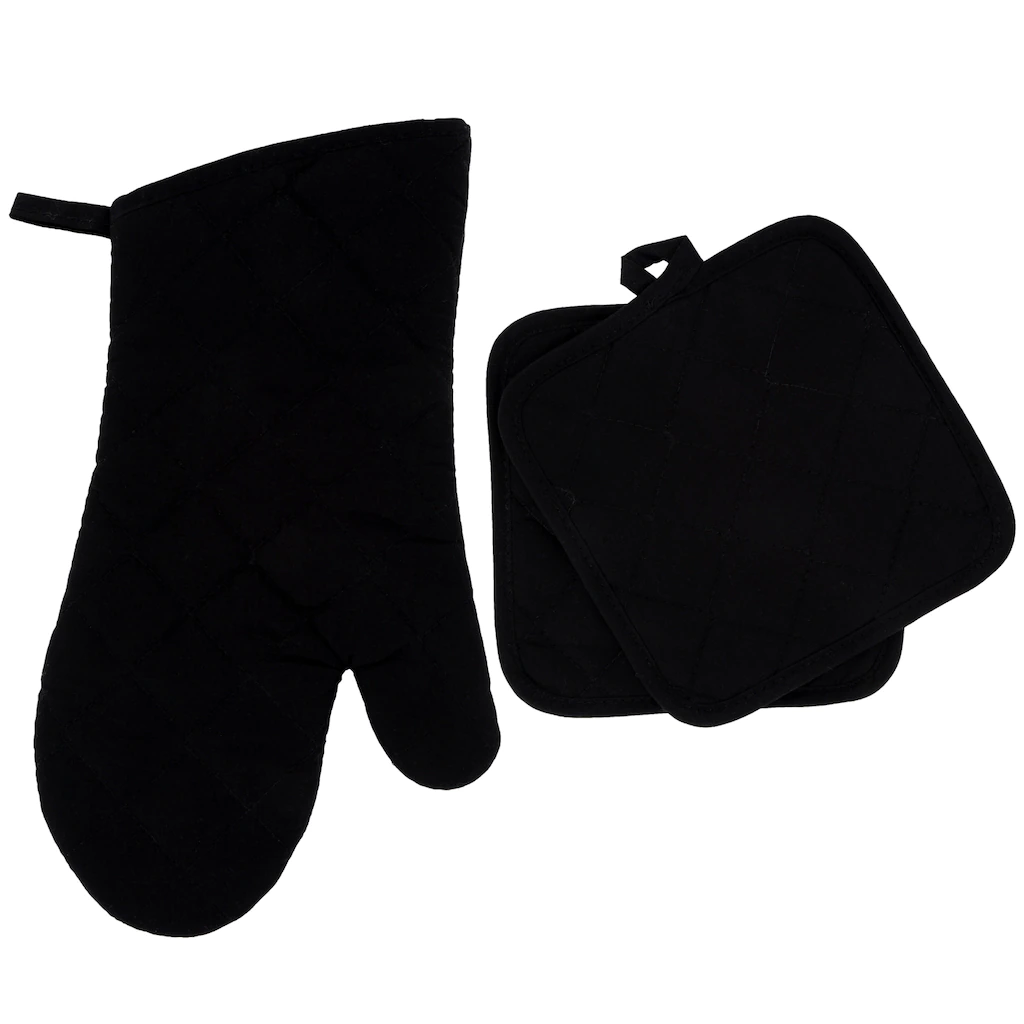 Assortment Details: Home Collection™ Black Cotton Kitchen Linens assorted between single 7×13-in. oven mitts (14 total, $1/ea.), and 2-ct. packs of 7×7-in. pot holders (10 packs, $1/ea). In total, you will receive 14 oven mitts, and ten 2-ct. packs of pot holders (20 total) for a total of 34 items