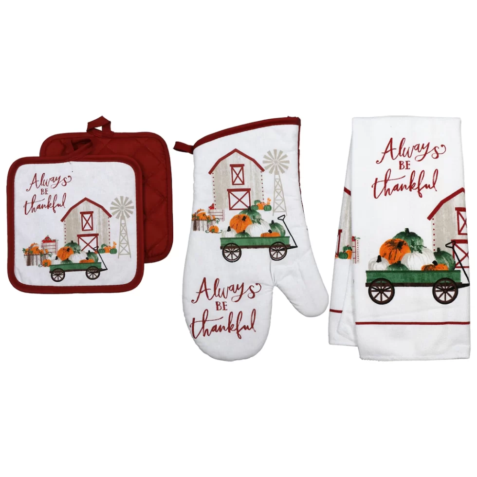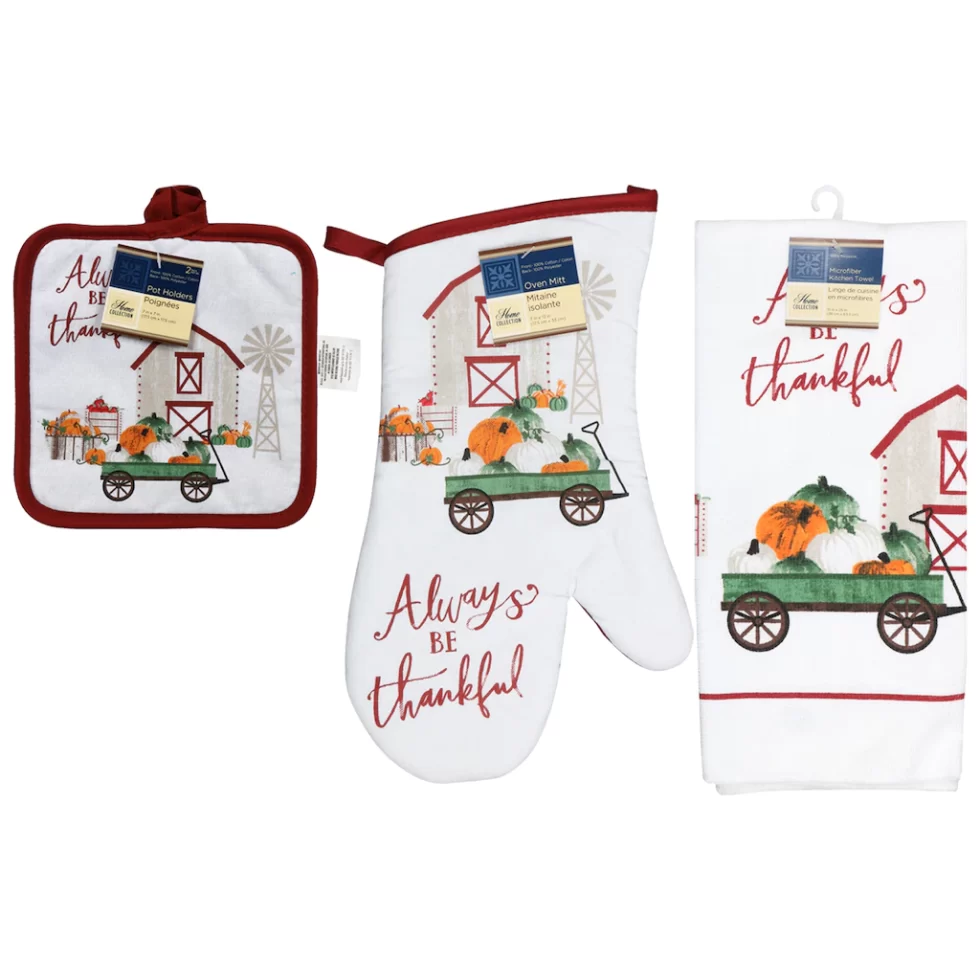 Assortment Details: Home Collection Country Autumn Kitchen Linens come assorted among 7×13-in. oven mitts, 15×25-in. kitchen towels, and 2-ct. packs of 7×7-in. potholders.