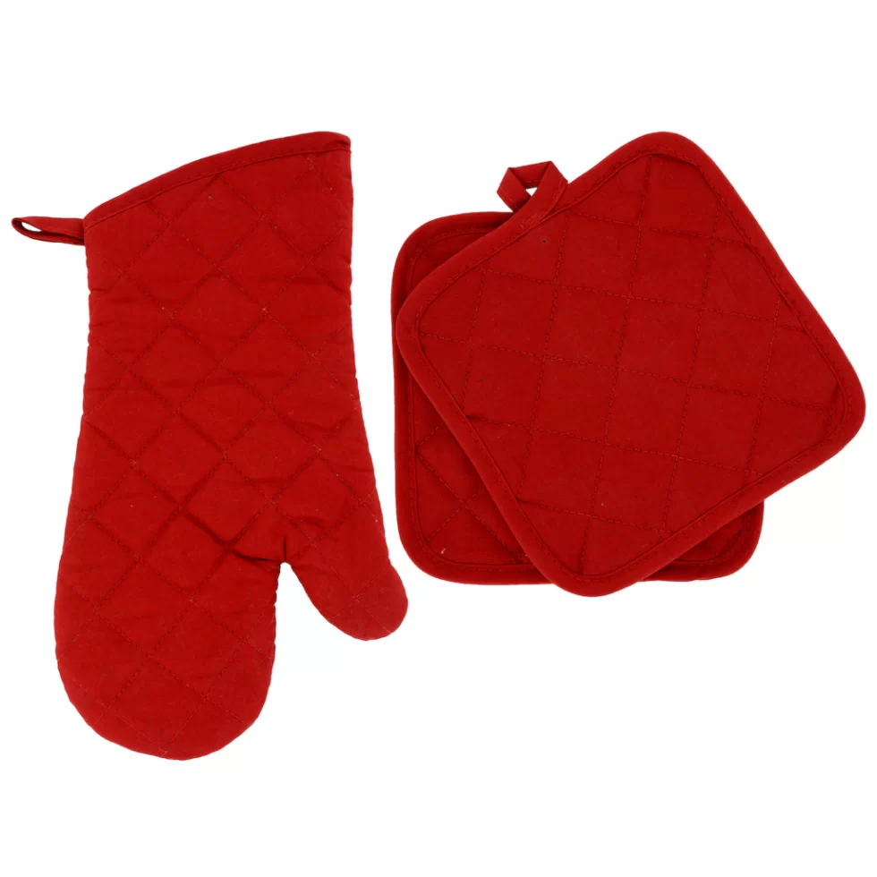 Assortment Details: Home Collection™ Red Cotton Kitchen Linens assorted between single 7×13-in. oven mitts (14 total, $1/ea.), and 2-ct. packs of 7×7-in. pot holders (10 packs, $1/ea). In total, you will receive 14 oven mitts, and ten 2-ct. packs of pot holders (20 total) for a total of 34 items
