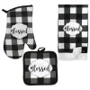 Material Breakdown: Kitchen Towel – 100% Polyester. Oven Mitt & Potholder: front 100% cotton, back 100% polyester.