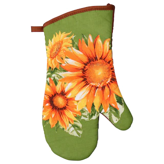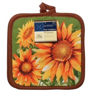Assortment Details: Home Collection™ Sunflower-Printed Kitchen Linen Collections including 15×25-in. printed kitchen towels, 13×7-in. oven mitts, and 2-ct. packs of 7×7-in. potholders.