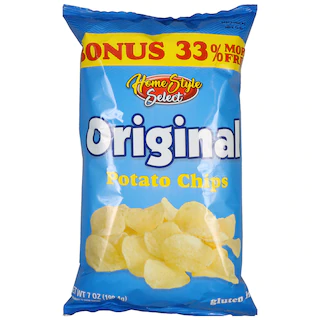 Snack on the crunchy salty original style potato chips from Homestyle Select™. They make a wonderful snack between meals, addition to your lunch, and crunchy treat to serve at parties and gatherings.