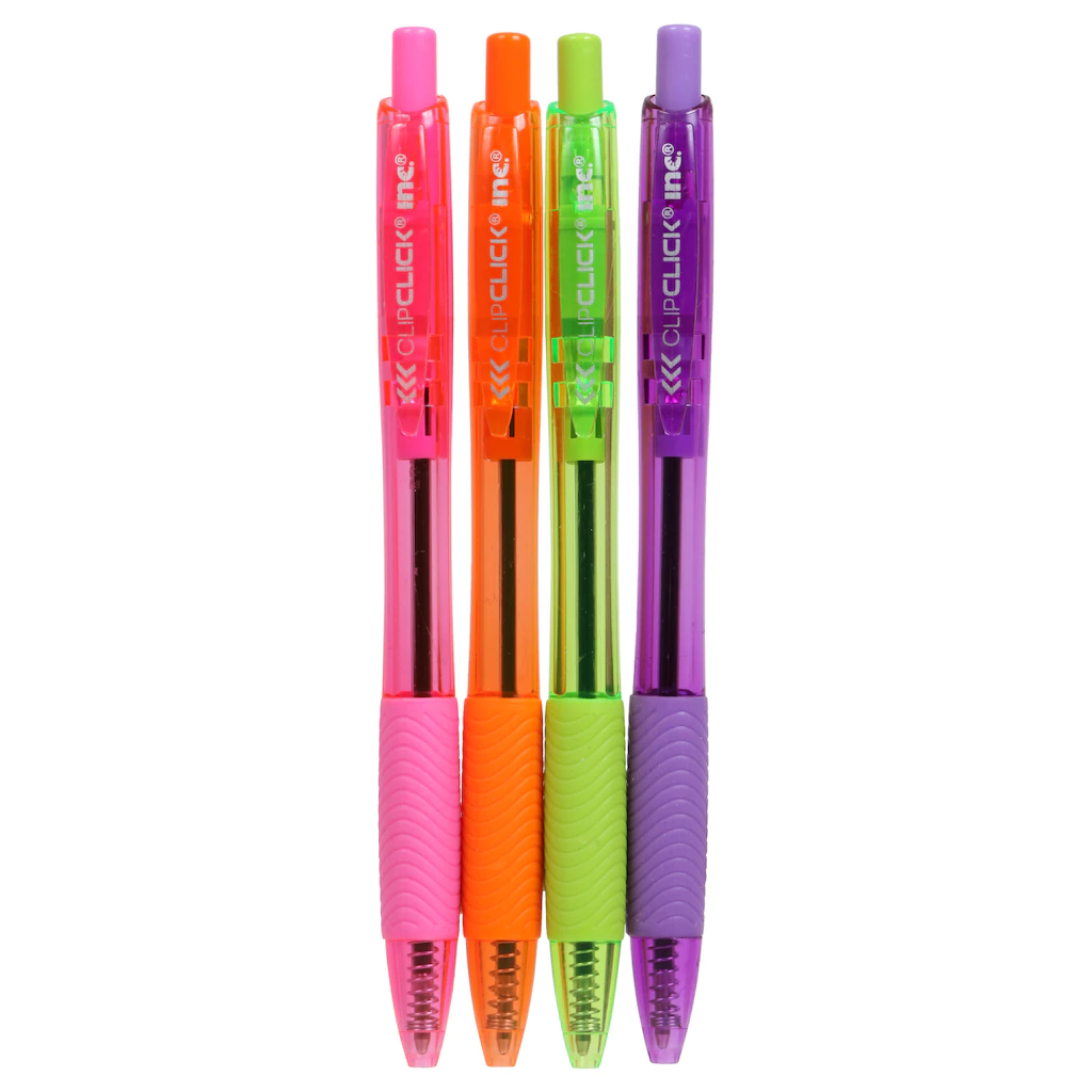 Easy ClipClicks™ retractable pen is built for speed! Rubberized textured comfort grip design keeps the pen from slipping from or tiring your hand. Smooth, bold ink flow allows the pen to move with ease and consistency. The 8-ct. packs include pink, purple, green, and orange colors.