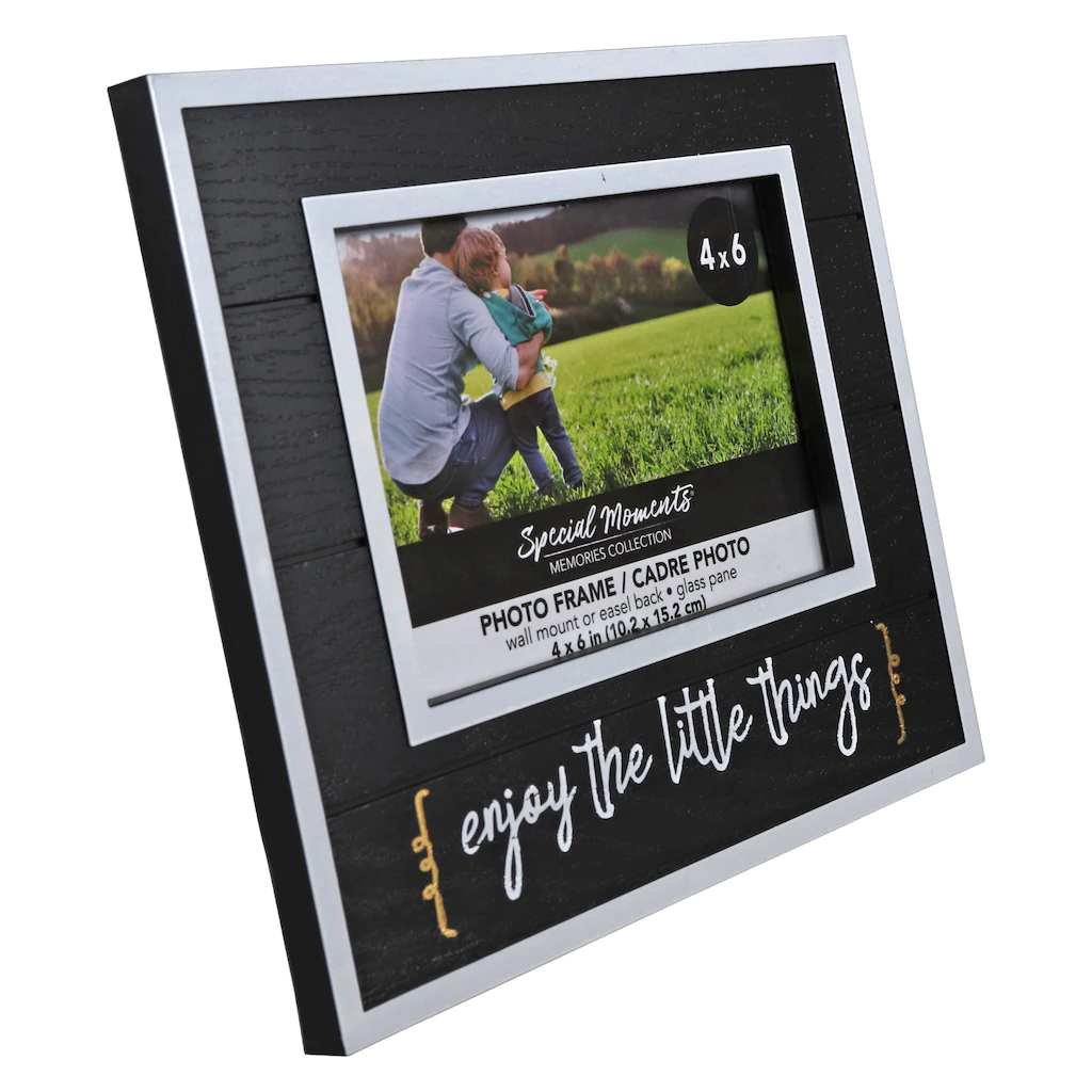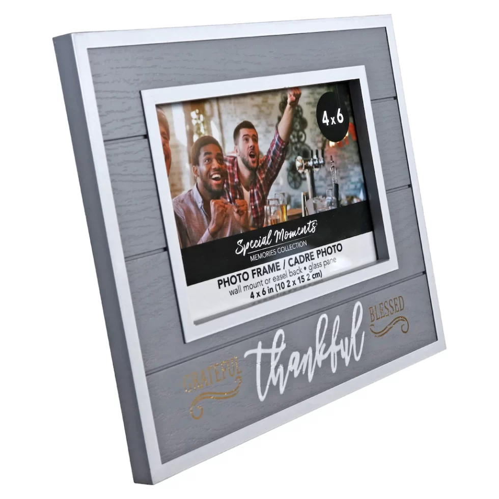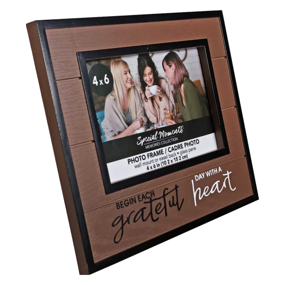 Assortment Details: 7.875×6.625-in inspirational photo frames for 4×6-in photos assorted among, Grateful, Thankful, Blessed (gray), Family, a whole lot of Love (white), Begin Each Day with a Grateful Heart (brown), and Enjoy the Little Things (black)