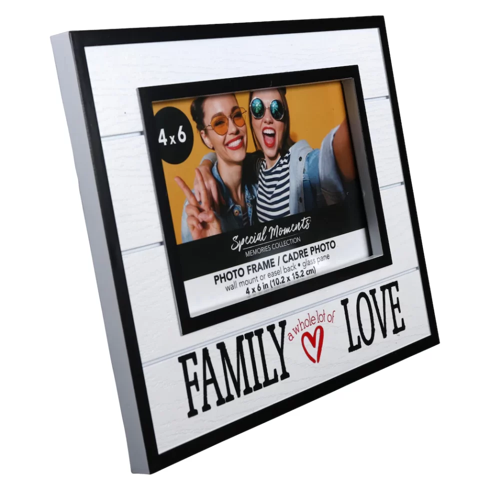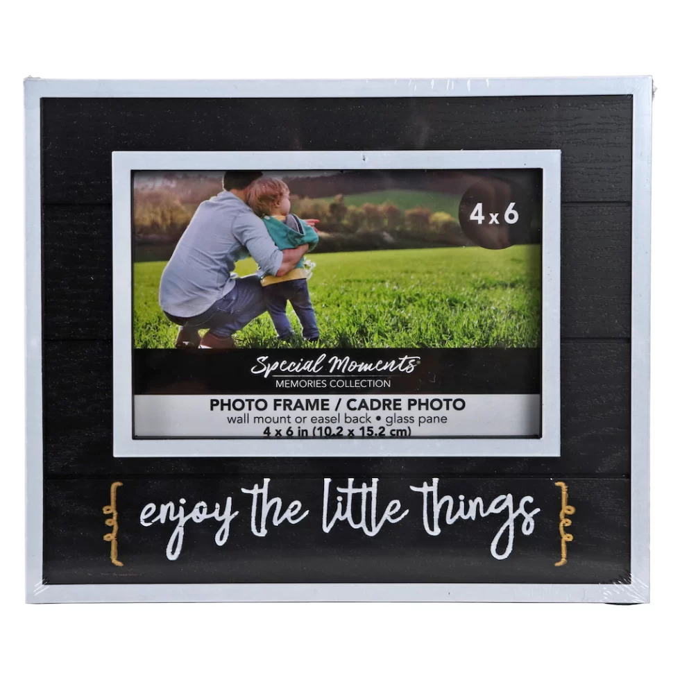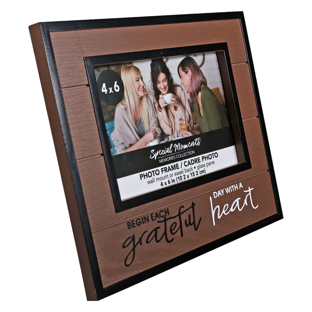 Assortment Details: 7.875×6.625-in inspirational photo frames for 4×6-in photos assorted among, Grateful, Thankful, Blessed (gray), Family, a whole lot of Love (white), Begin Each Day with a Grateful Heart (brown), and Enjoy the Little Things (black)