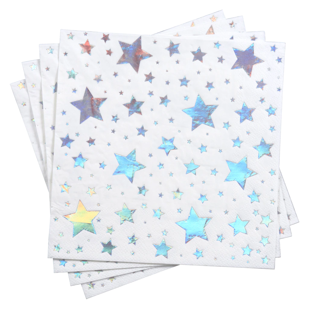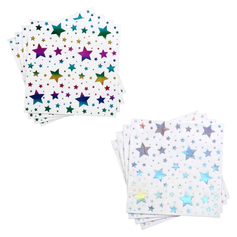 These shiny napkins will be the star of the show at your next event! Scattered with shimmering stars, these 2-ply white napkins measure 13×13 in. and come assorted between 20-ct. packs of solid iridescent stars and 20-ct. packs of metallic rainbow stars. These absorbent napkins also pair wonderfully with our Iridescent & Metallic Rainbow Party supplies for the perfect party theme. Or, mix and match with our other solid-color party supplies for an excellent variety of options!