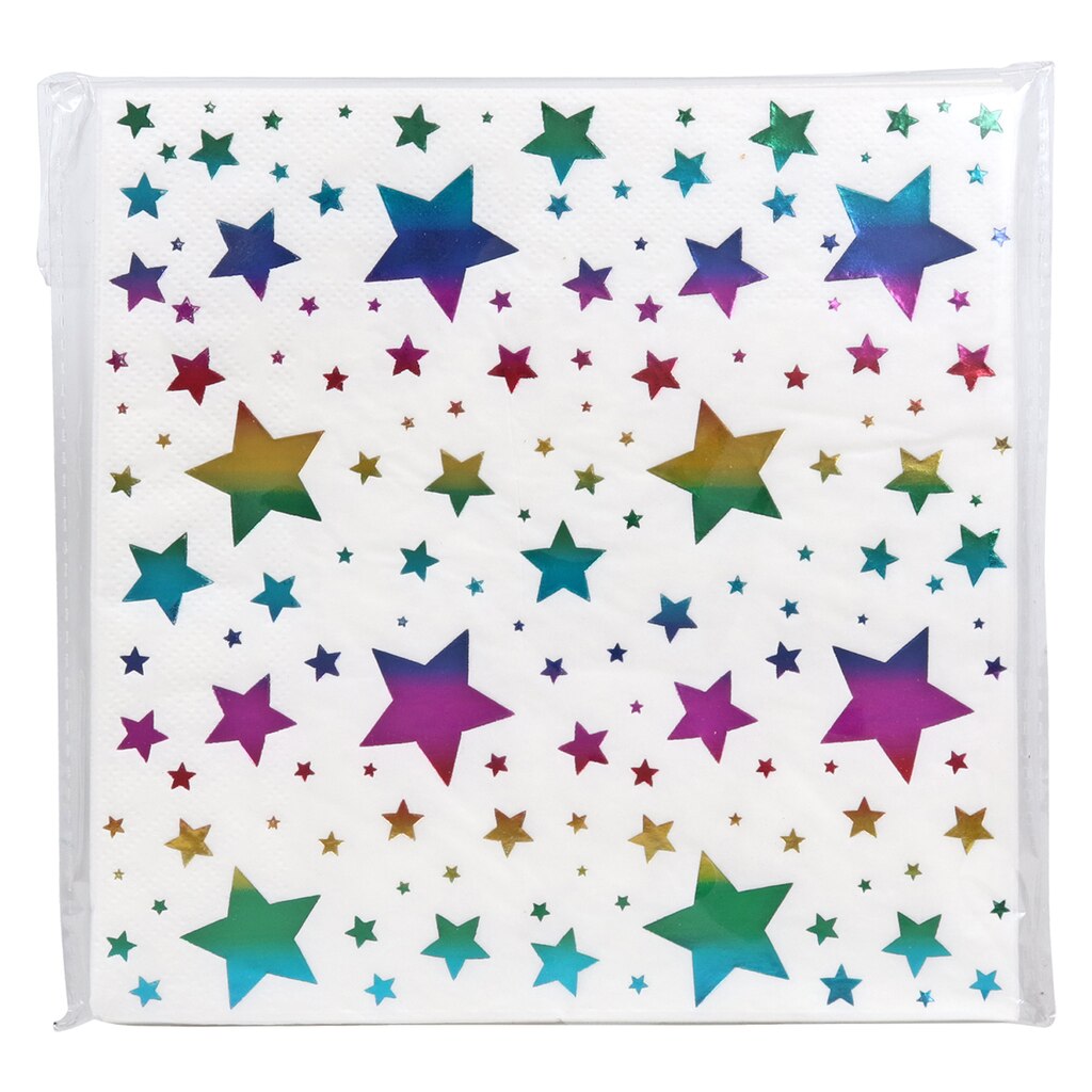 Assortment Details: 20-ct. packs of Iridescent & Metallic Rainbow Party 13-in. Paper Napkins assorted between packs of napkins with solid iridescent stars and packs of napkins with metallic rainbow stars.