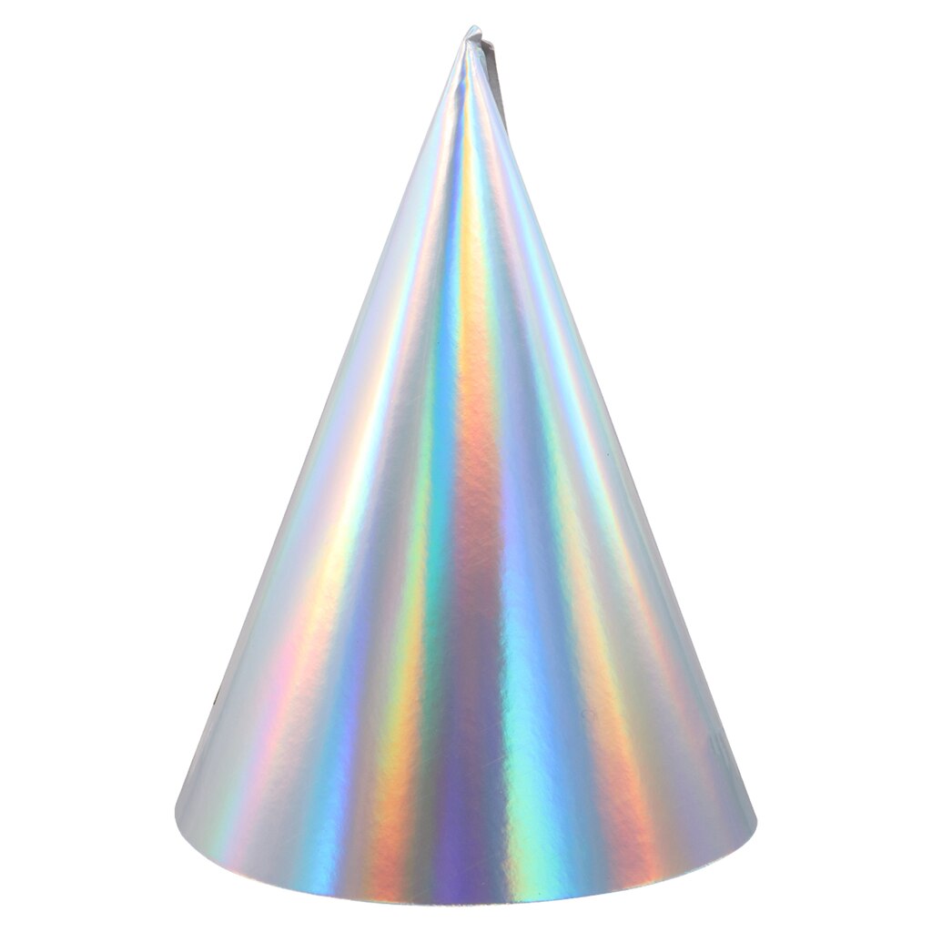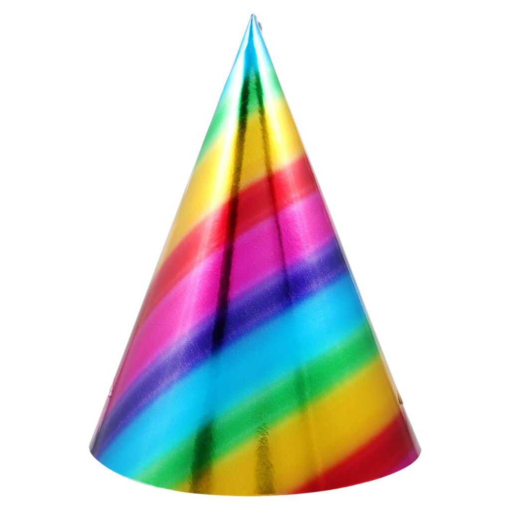 Assortment Details: 8-ct. packs of 6.25×4.25-in. Iridescent & Metallic Rainbow Party Cone Hats assorted between packs of solid iridescent hats and packs of metallic rainbow hats. One size fits most.