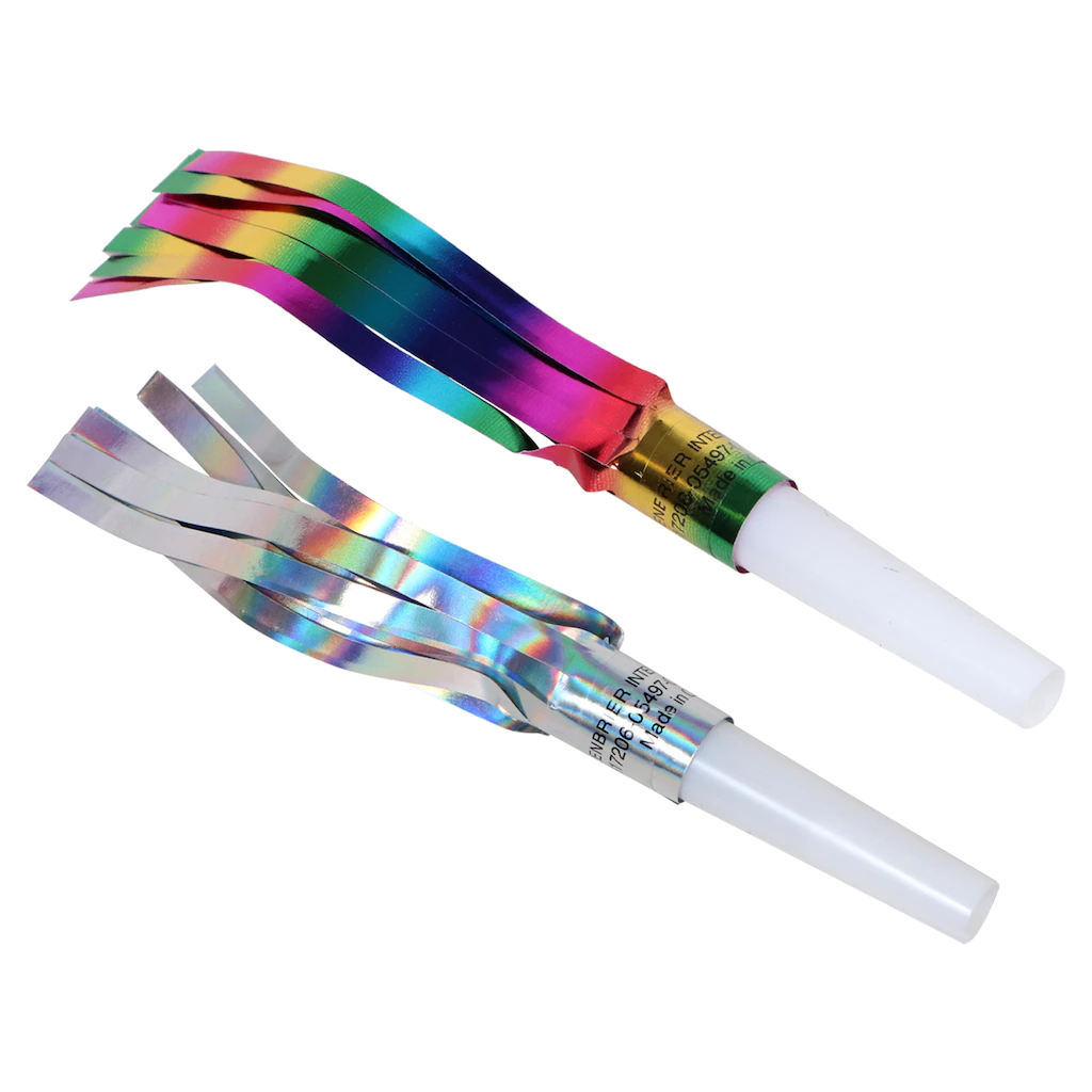 Make some noise at your next party with these Iridescent & Metallic Rainbow Party Fringed Squawkers! Assorted between 12-ct. packs of solid iridescent and 12-ct. packs of metallic rainbow, each case includes dozens of celebratory noisemakers with fringed foil for emphasis. These squawkers pair wonderfully with our Iridescent & Metallic Rainbow Party supplies for the perfect party theme. Or, mix and match with our other solid-color party supplies for an excellent variety of options. Ideal for birthdays, graduations, and more! Ages 2+.