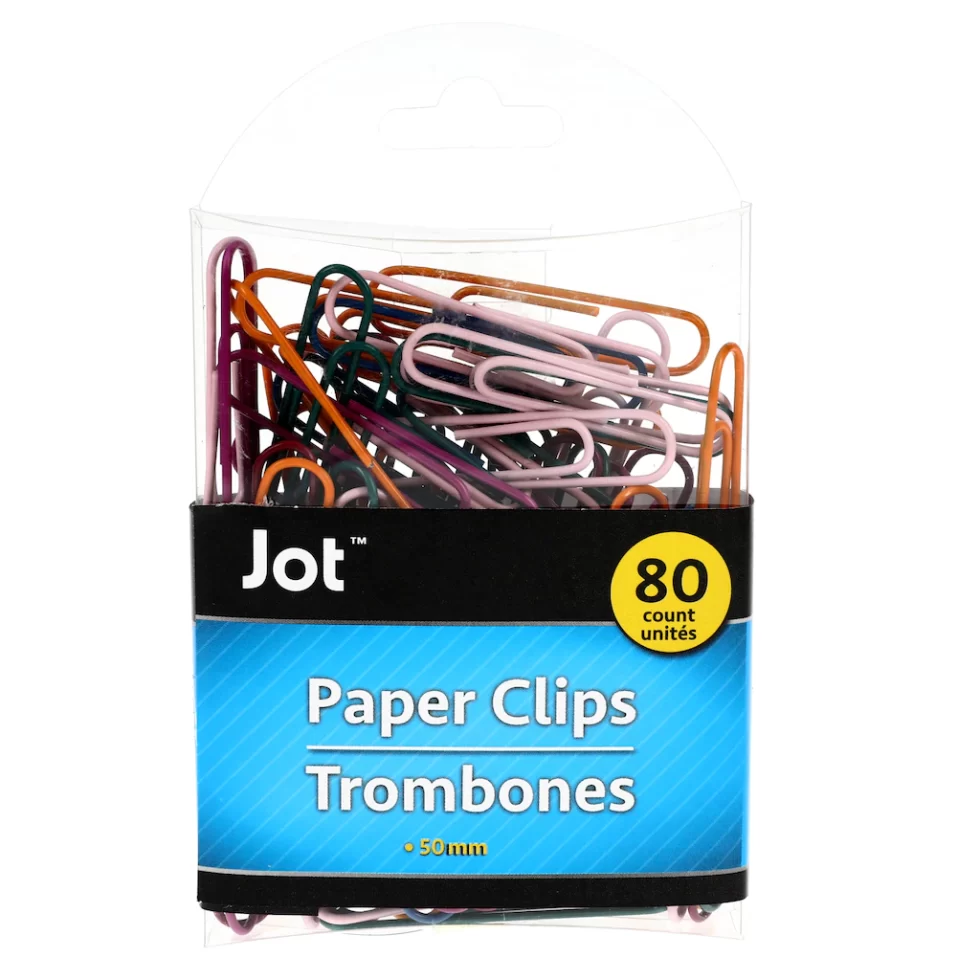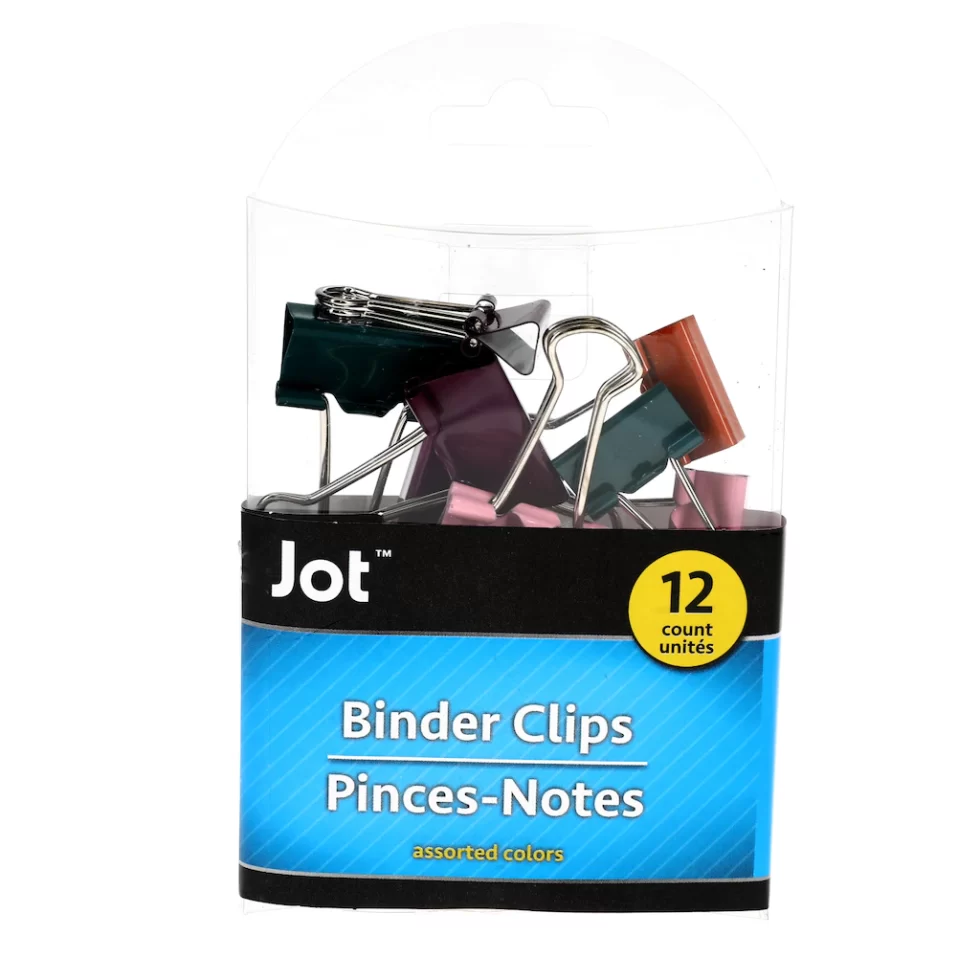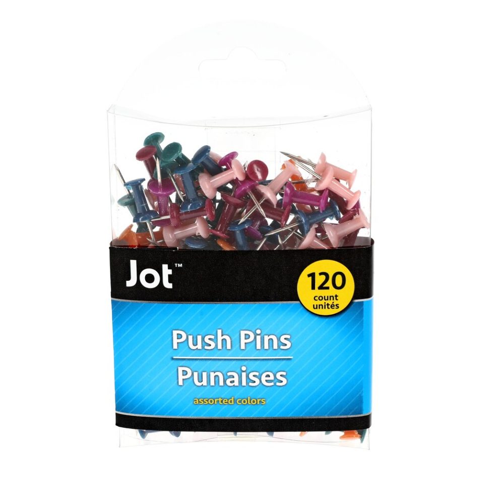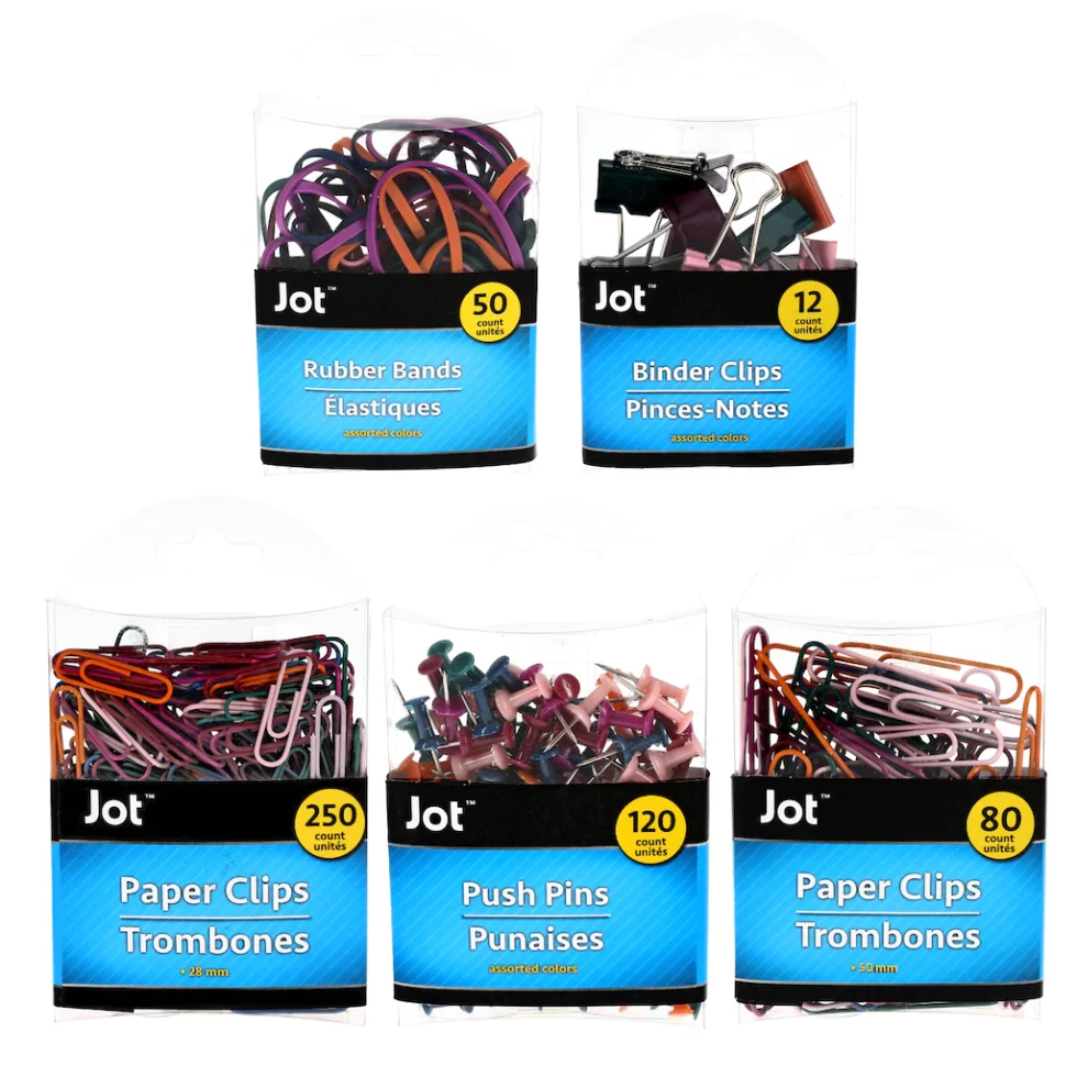 Assortment Details: Jot™ Assorted Colorful Binding Pins assorted among 250-ct. packs of 28-mm. paper clips, 120-ct. packs of push pins, 50-ct. packs of rubber bands, 80-ct. packs of 50-mm. paper clips, and 12-ct. packs of binder clips