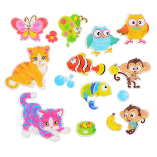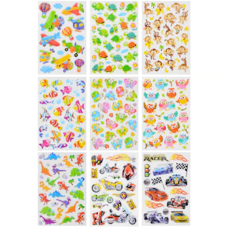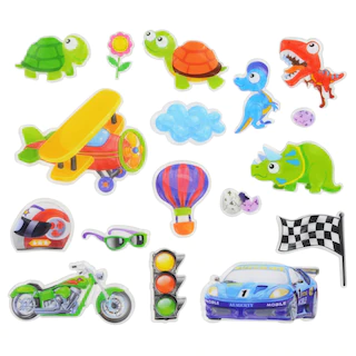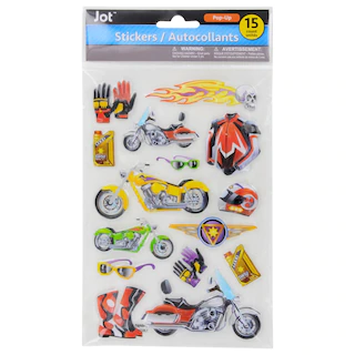 Assortment Details: Jot™ Pop-Up Foil Stickers assorted among cats, motorcycles, aviation, monkeys, dinosaurs, race cars, turtles, butterflies, fish, and owls