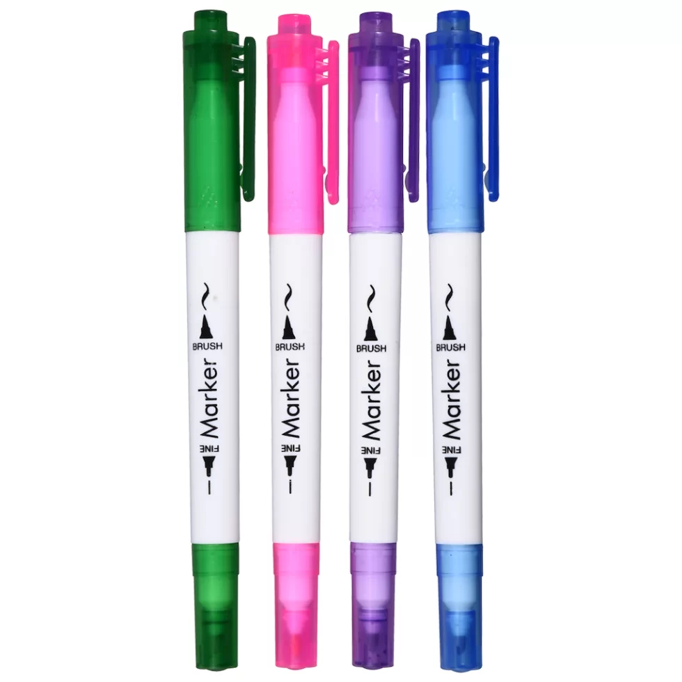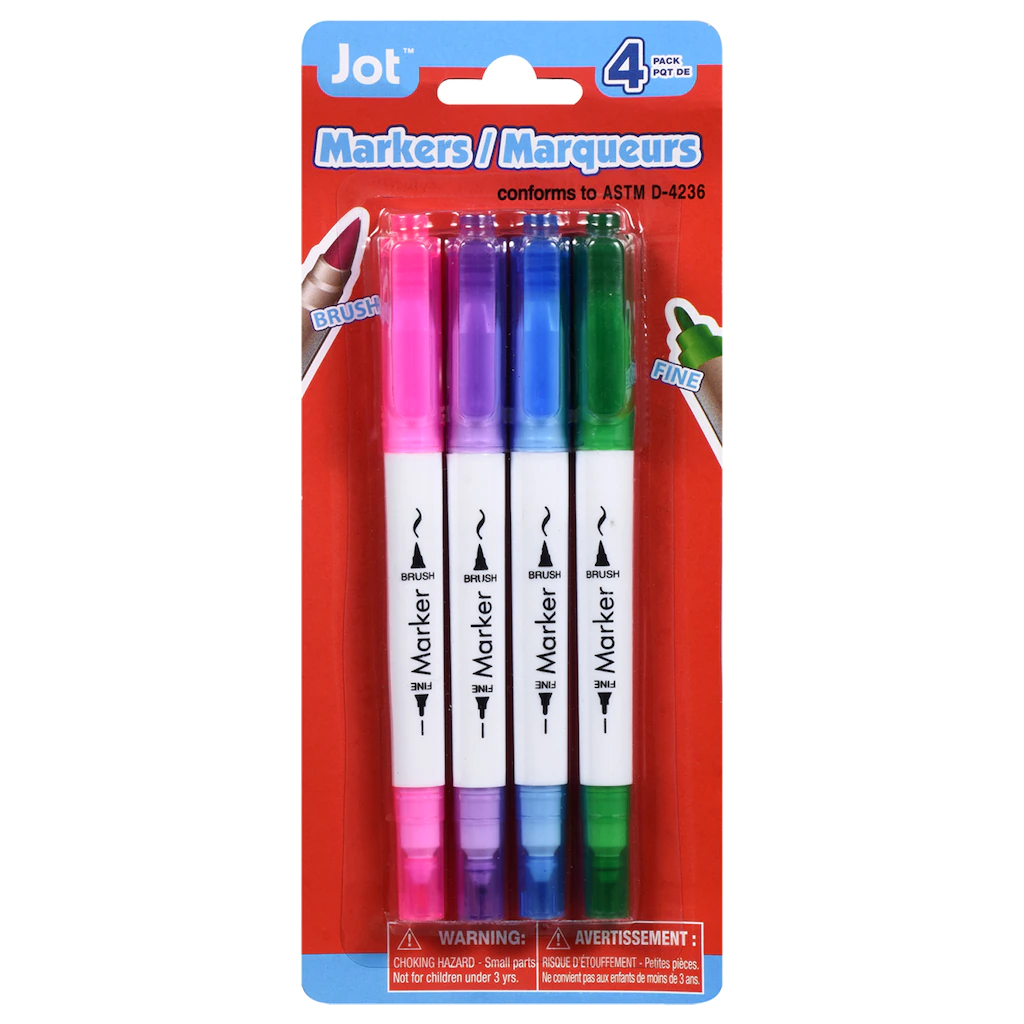 Easily decorate posters, notepads, canvases, and more with Jot™ Dual Tipped Markers! Each pack includes four markers �?? pink, purple, blue, and green �?? that have both a fine tip and a brush tip. These 5.625-in. markers also have a clip so you can secure them to the top of your paper or in your pocket. Perfect for school projects, work presentations, doodling, taking notes, and writing to-do lists!