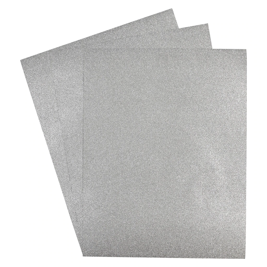 Assortment Details: 3-ct. packs of Jot™ 11×8.5-in. Glitter Paper with Adhesive Backing assorted among gray, yellow, purple, green, fuchsia, and aqua blue.
