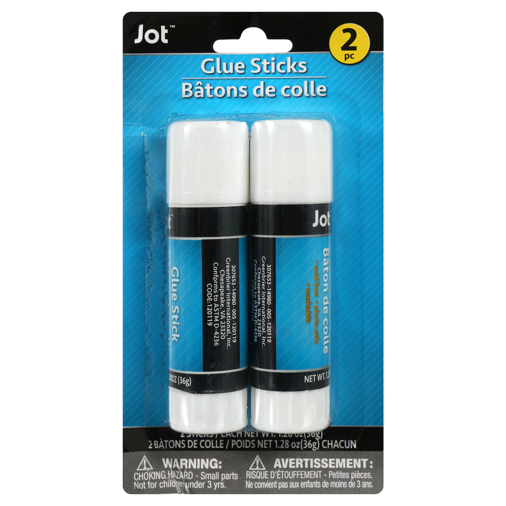 Glue together whatever you need with one easy step. 2-ct. packs of jumbo glue sticks by Jot™ are perfect for crafters, artists, scrapbookers, students, teachers, and more! Classrooms, homes, offices, and art studios will benefit greatly from having them on hand. They’re also excellent for resale in school or office supply stores.