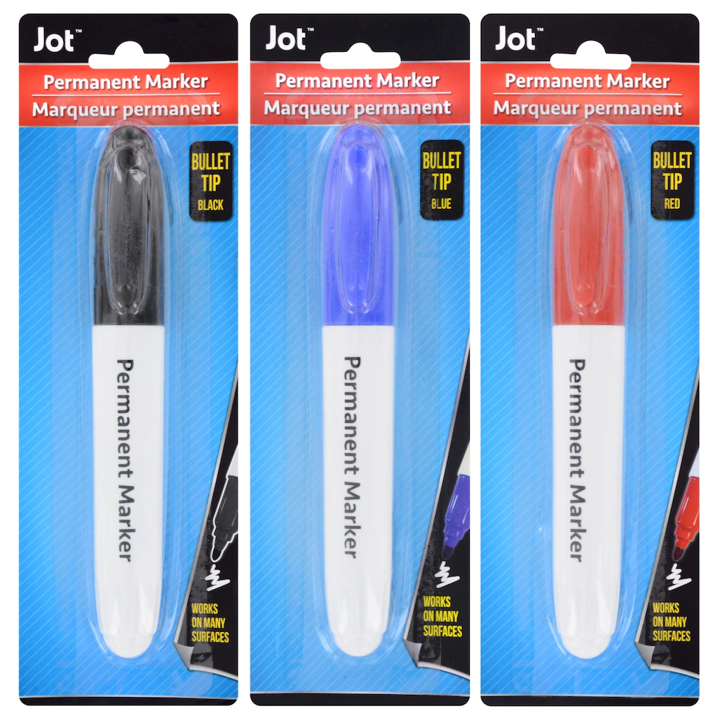 Assortment Details: Jot™ Jumbo Permanent Markers including black, blue, and red markers.