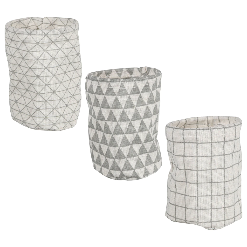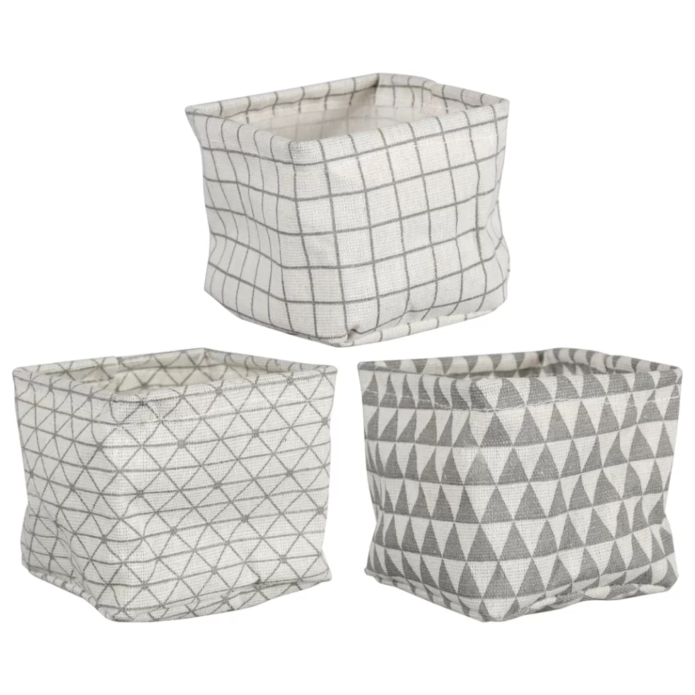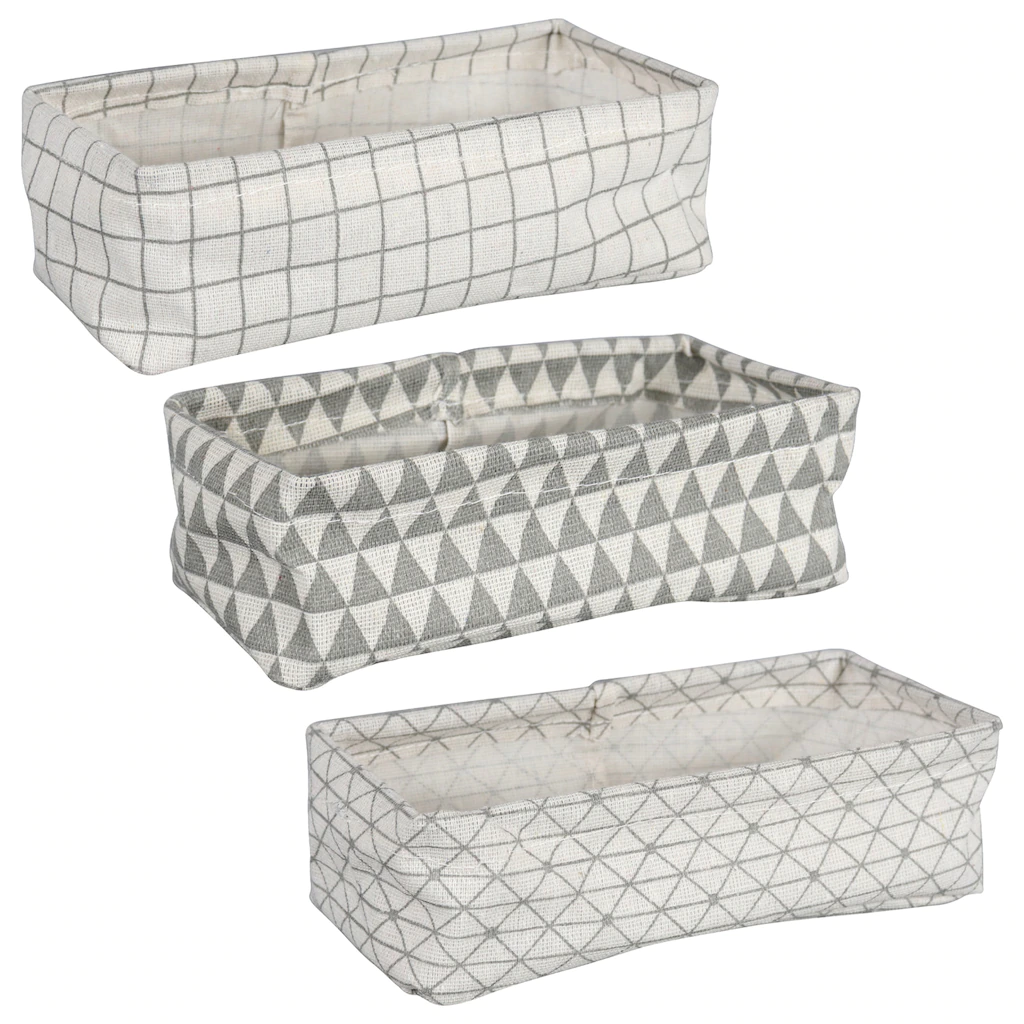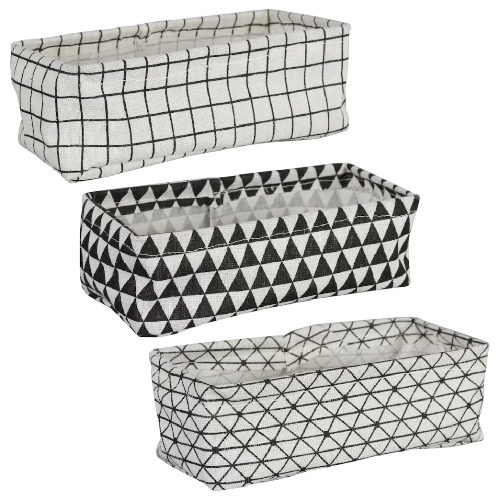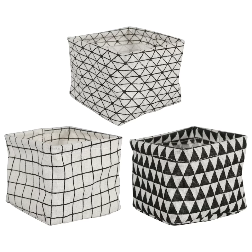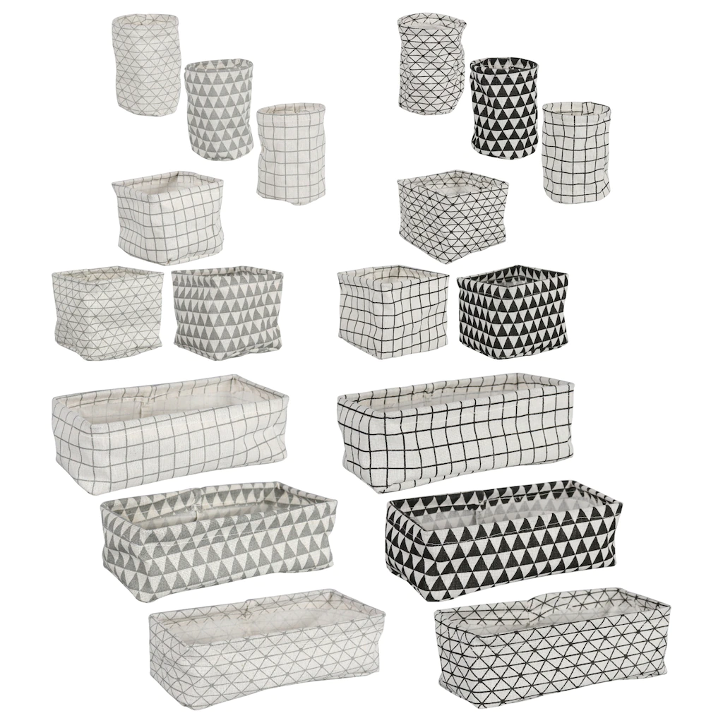 These material desk organizers are assorted among three different shapes (square, rectangular, and round) and two different color combinations (black & white and gray & white) . Use them in your home offices and at work. You can also use them to organize other drawers in your home. The organizers measure A) 4x4x3.5H in. B) 4.25Hx3.0 in. C) 3.5×7.5×2.5H in.