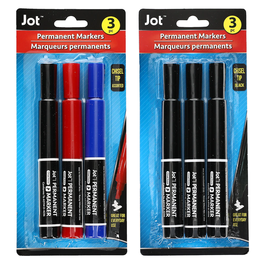 Assortment Details: 3-ct. packs of Jot® Permanent Markers assorted among 2 color packs: 3 all black, and 3 including red, black, and blue